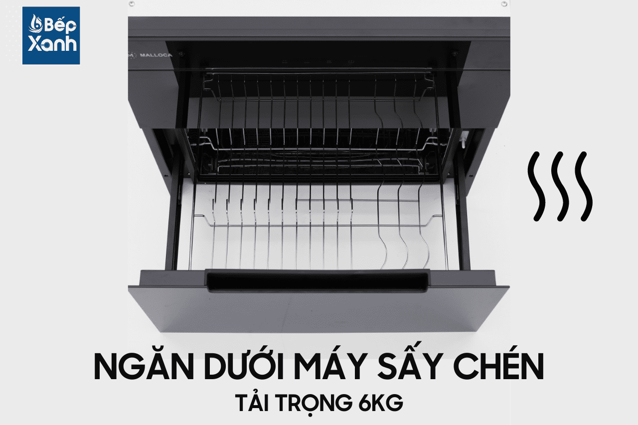 Ngăn dưới chỉ có chức năng sấy. Ngăn này rộng hơn, có tải trọng 6kg nên bạn sắp vật dụng lớn hơn như dĩa, tô, xoong nồi.