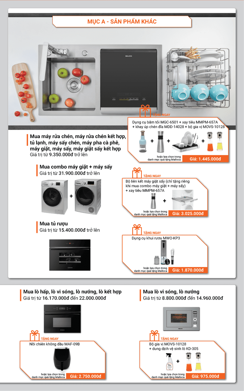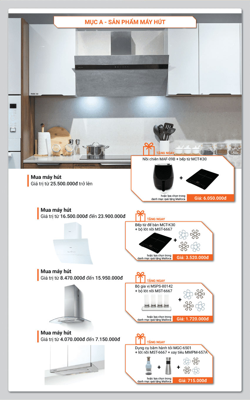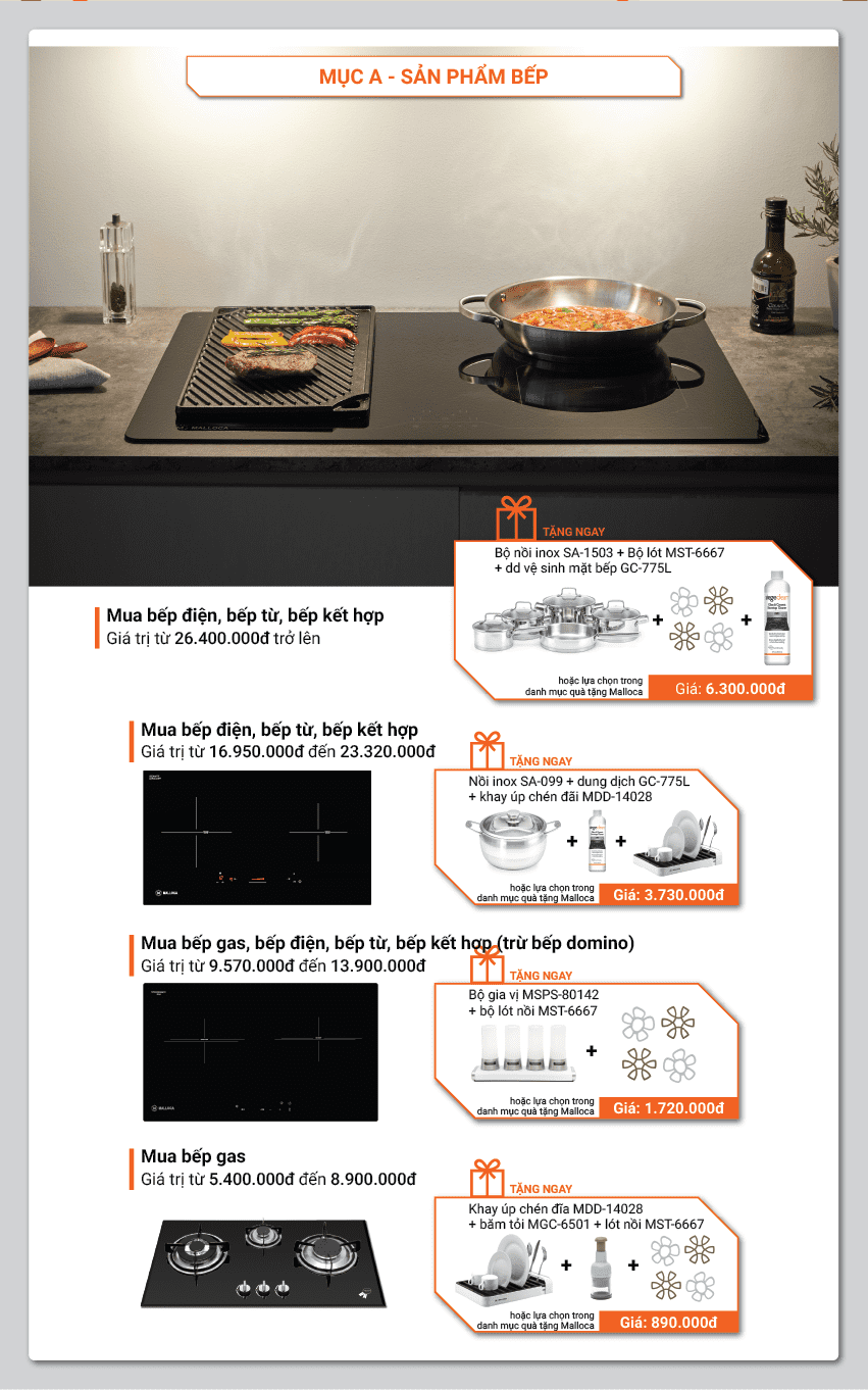 Theo đó, khi mua máy hút mùi, bếp điện từ, lò nướng, lò vi sóng, máy rửa chén... hoặc bất kỳ sản phẩm thiết bị bếp của Malloca, khách hàng sẽ nhận được quà tặng với nhiều trị giá khác nhau. Khách hàng lựa chọn 1 trong 2 mục khuyến mãi A- theo sản phẩm hoặc B-theo đơn hàng.