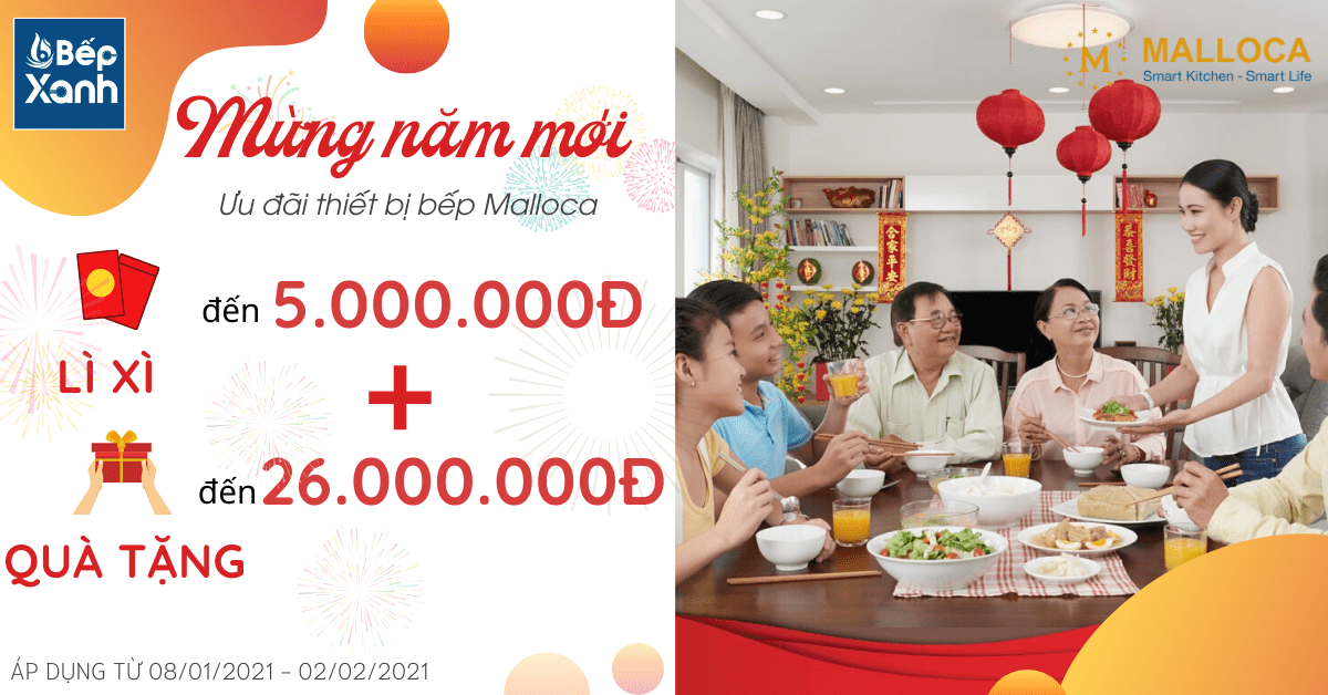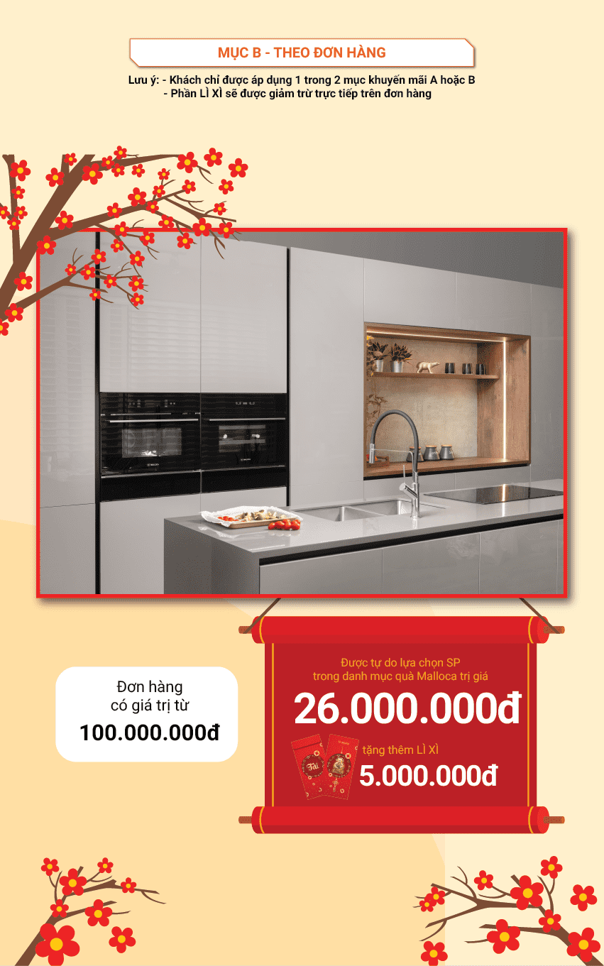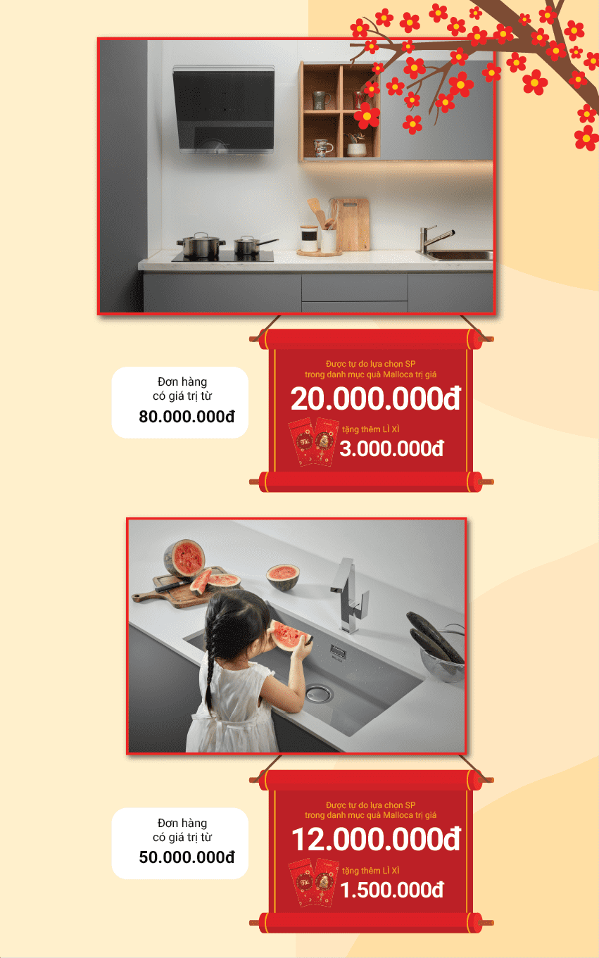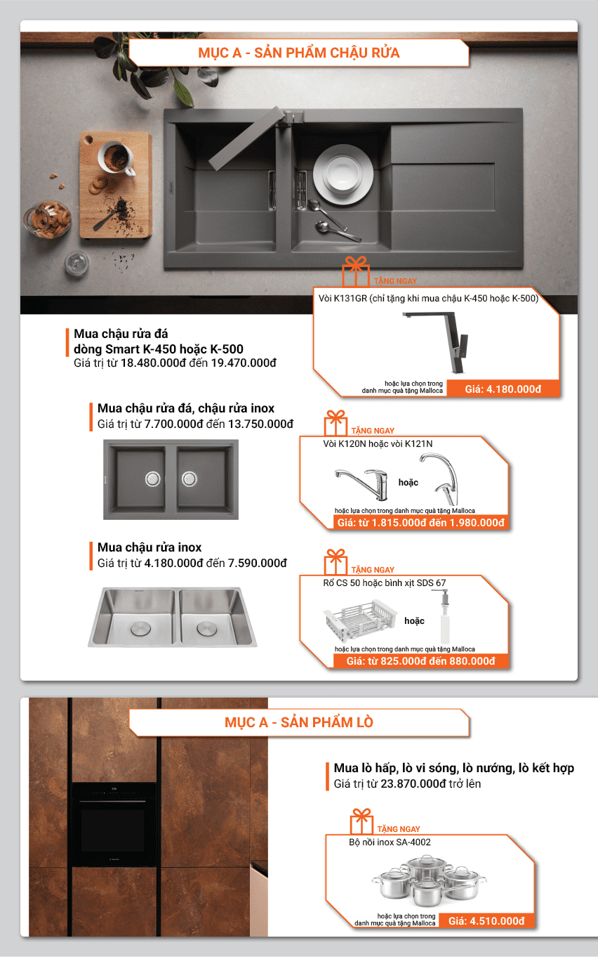 Theo đó, khi mua máy hút mùi, bếp điện từ, lò nướng, lò vi sóng, máy rửa chén... hoặc bất kỳ sản phẩm thiết bị bếp của Malloca, khách hàng sẽ nhận được quà tặng với nhiều trị giá khác nhau. Khách hàng lựa chọn 1 trong 2 mục khuyến mãi A- theo sản phẩm hoặc B-theo đơn hàng.