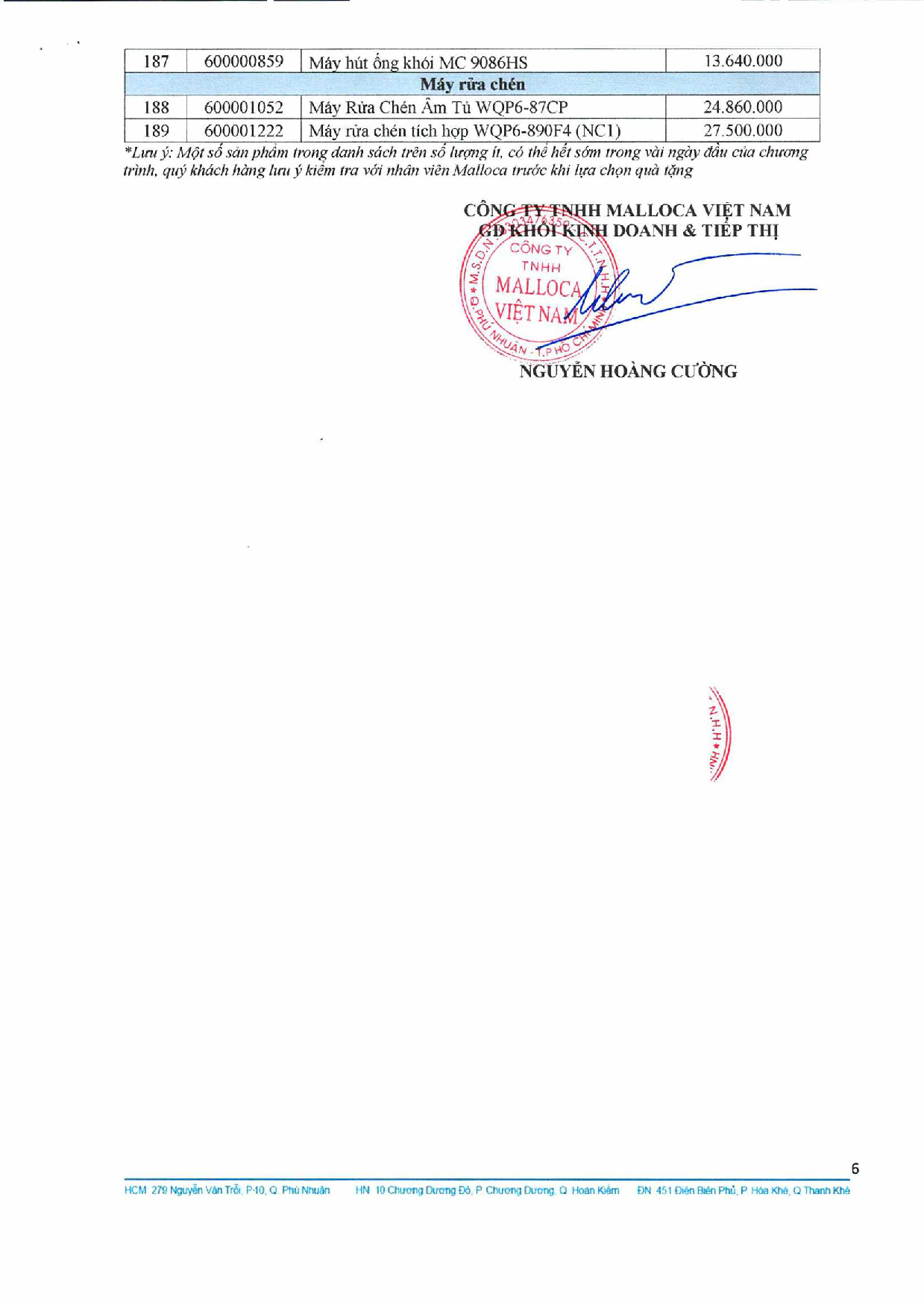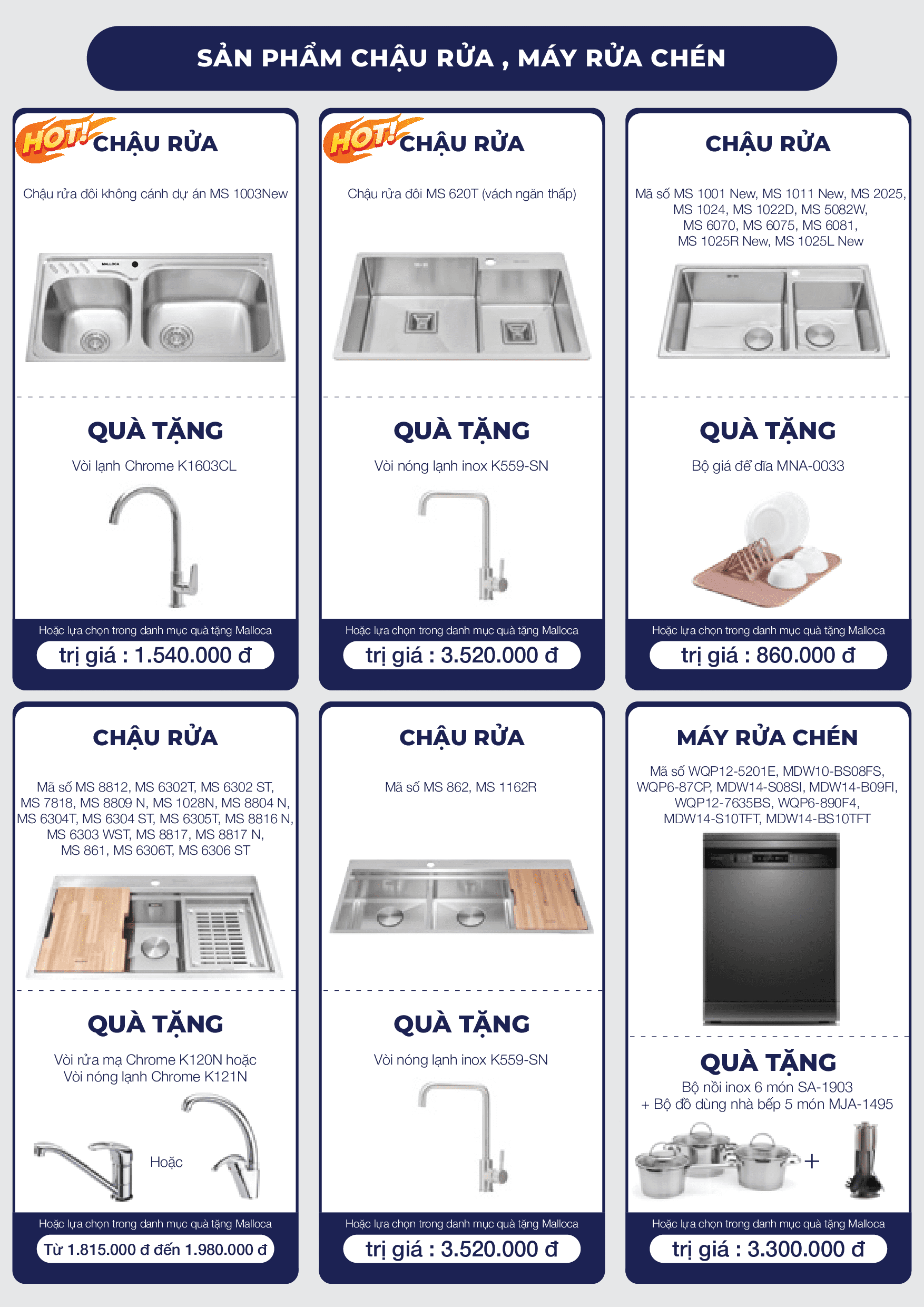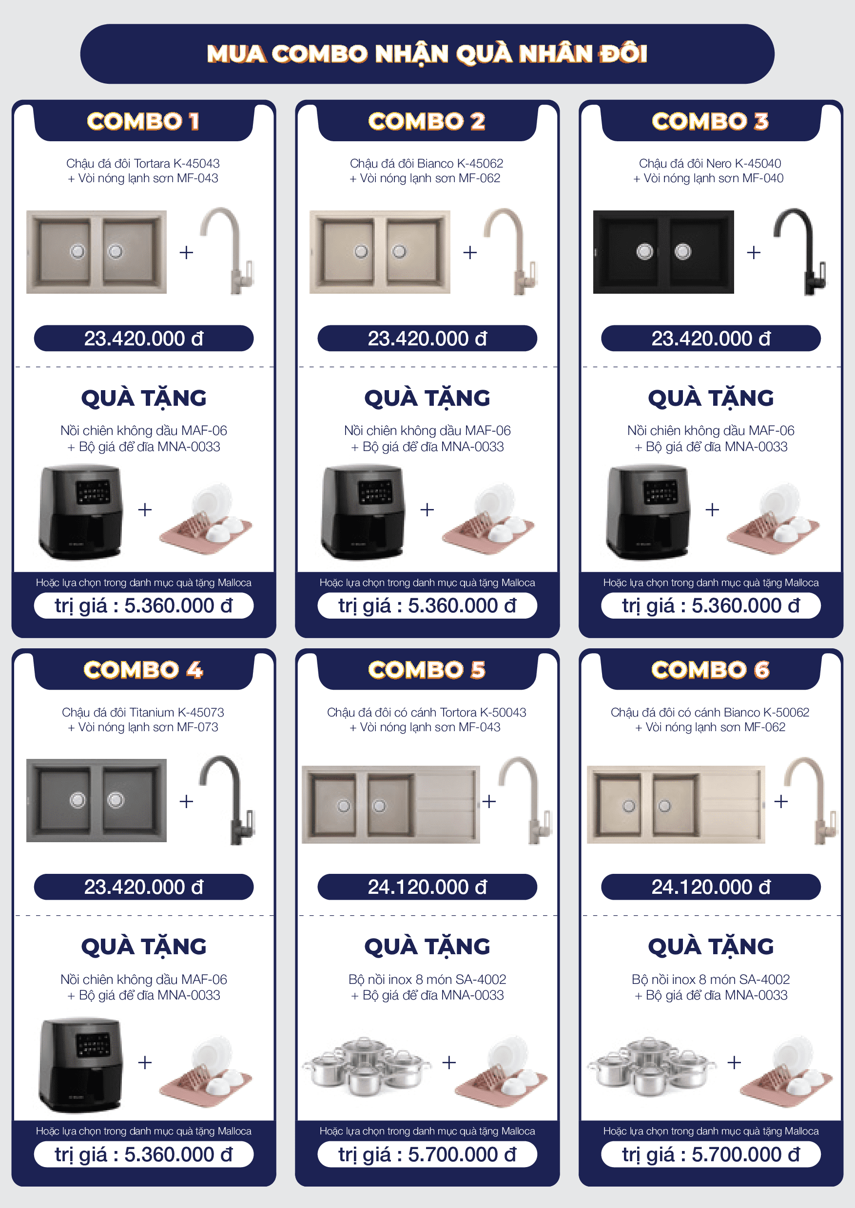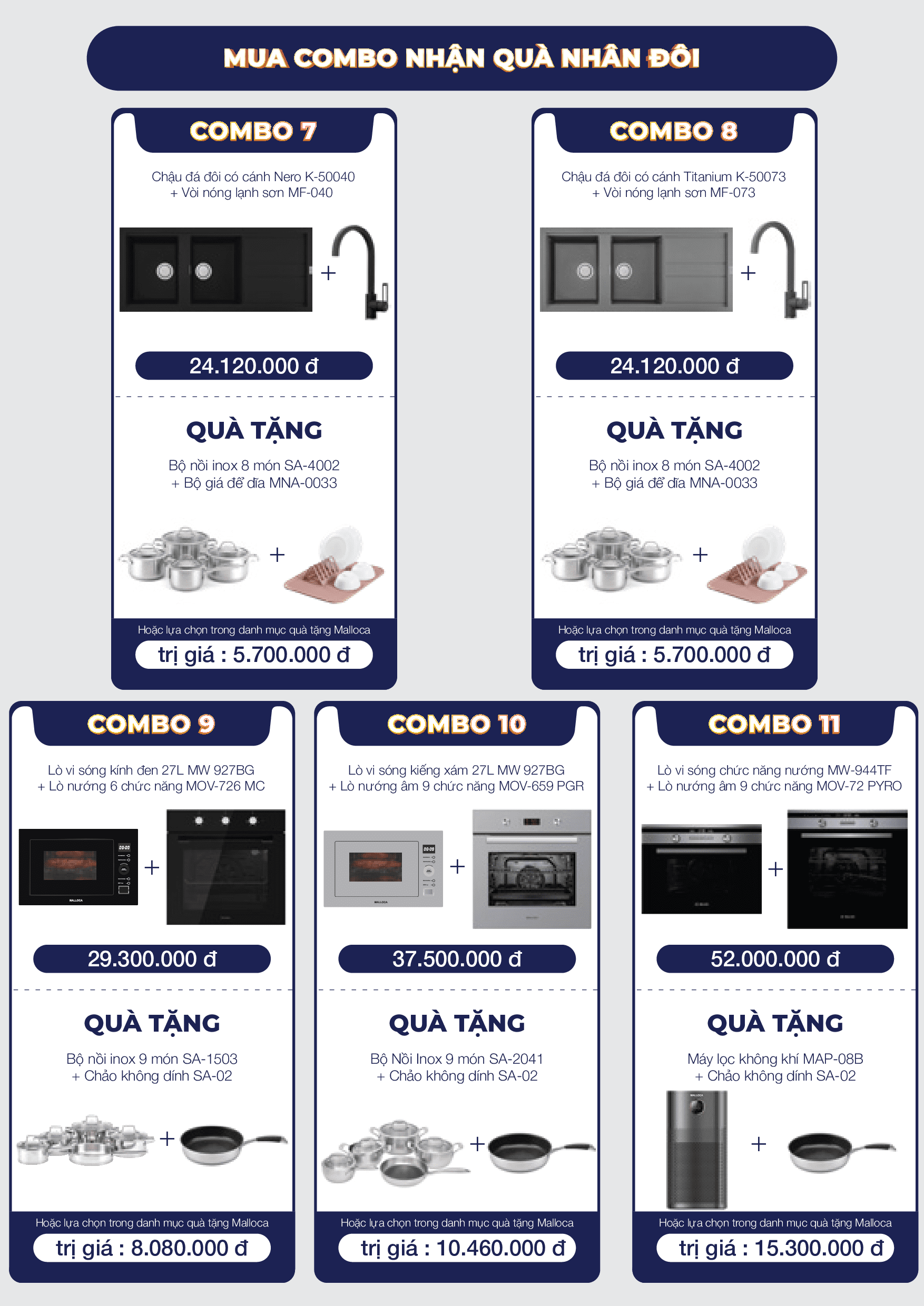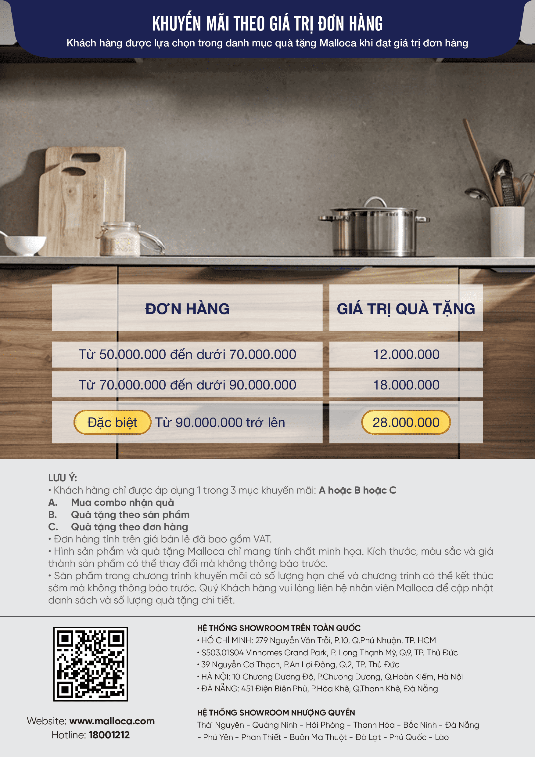 Theo đó, khi mua các sản phẩm của hãng thiêt bị bếp Malloca trong chương trình khuyến mãi, khách hàng sẽ nhận được quà tặng với nhiều trị giá khác nhau. Khách hàng lựa chọn 1 trong 3 mục khuyến mãi A - Mua combo nhận quà nhân đôi; B - Quà tặng theo sản phẩm hoặc C - Quà tặng theo giá trị đơn hàng. Chương trình hiện tại được áp dụng tại tất cả các showroom siêu thị Bếp XANH.