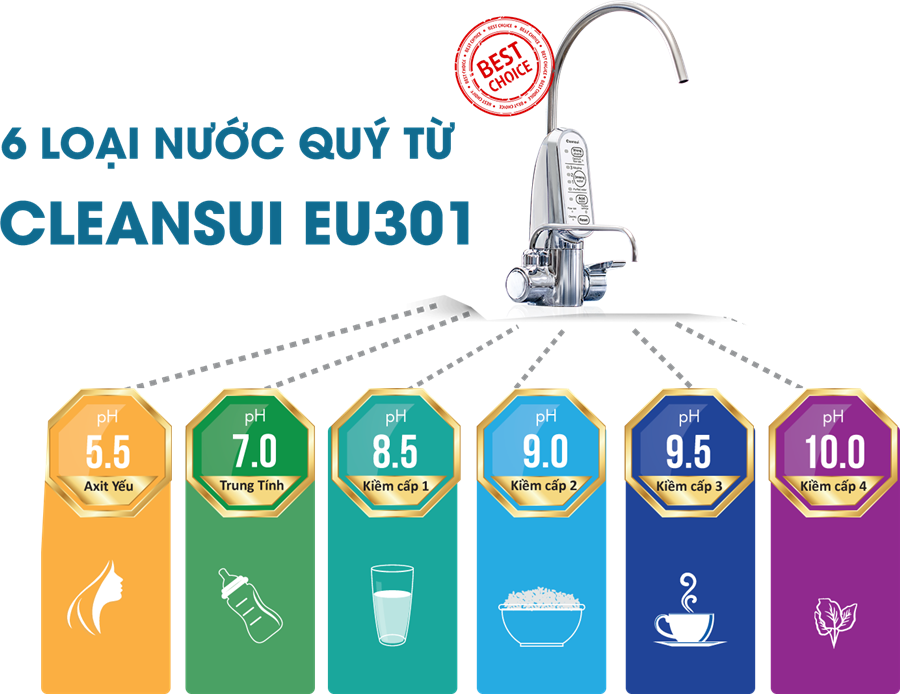 Máy điện giải Cleansui EU301 sẽ cho ra 5 loại nước quý, giúp gia đình bạn an tâm sử dụng nguồn nước an toàn và hiệu quả