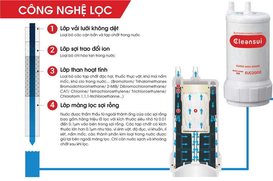 Để nước có thể đạt tiêu chuẩn cho vào giai đoạn điện giải, bộ lọc nước tích hợp trong máy lọc nước điện giải Cleansui EU301 được tích hợp 4 cơ chế lọc cực kỳ ưu việt, bao gồm: