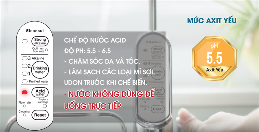 Bạn có thể sử dụng nước Axit yếu có PH – 5.5 để dùng trong sinh hoạt hàng ngày. Sử dụng thời gian dài, hiệu quả sẽ cảm nhận rõ rệt: