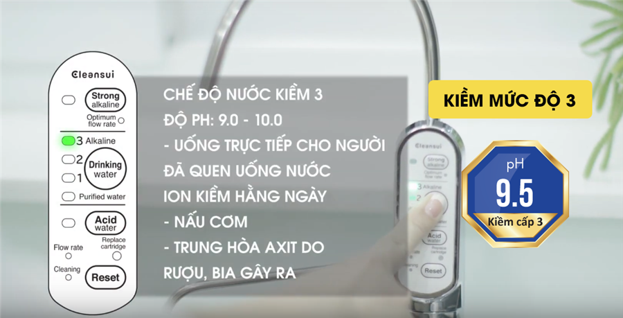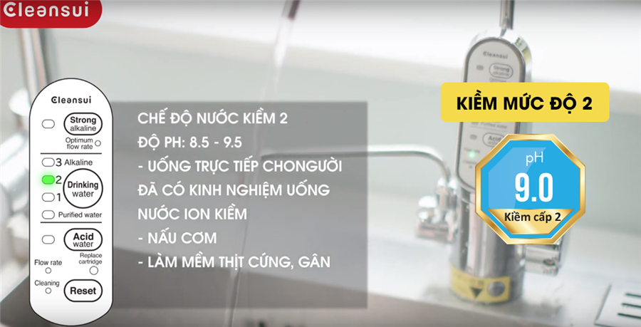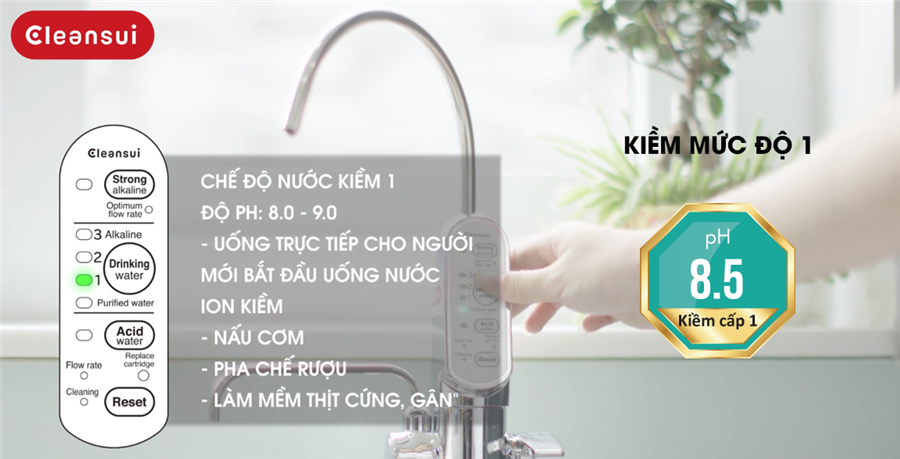Nước kiềm Cleansui EU301 ở mức kiềm cấp độ 2, có PH 8.5 – 9.0 dùng để uống khi bạn đã quen với việc uống nước kiềm cấp độ 1 (thường sau 1 tháng ở cấp độ 1). Việc sử dụng nước kiềm ở cấp độ 2 giúp trung hòa Axit dư thừa, cải thiện đường tiêu hóa, giảm ợ chua, giảm hiện tượng táo bón, ăn không tiêu, ngủ ngon hơn.