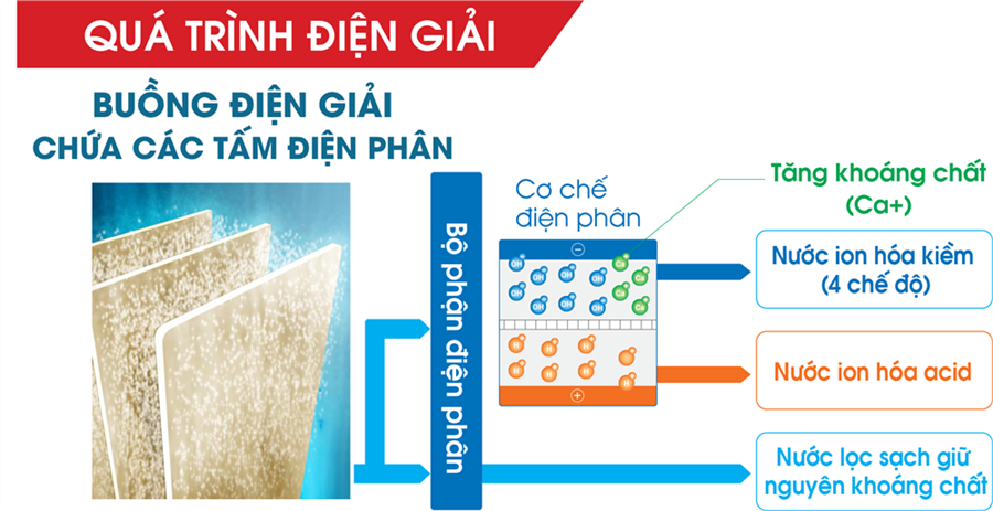 Nước đầu vào sau khi được lọc sạch sẽ vào buồng điện phân công suất cao với 5 tấm điện cực để phân tách các phân tử nước và tái cấu trúc các phân tử nước, nước ION KIỀM được sản sinh ở cực âm, nước ION AXIT (nước có tính axit) sẽ được sản sinh ở cực dương.