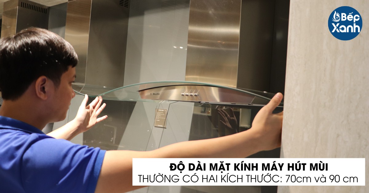 Độ dài mặt kính của máy hút mùi thường có hai kích thước thông thường là 70cm và 90cm. Ngoài ra thì trên thị trường cũng có một số dòng kính có kích thước 60cm và 80cm, chúng không quá phổ biến chủ yếu xuất hiện ở một số dòng máy hút mùi có kích thước tương đương.
