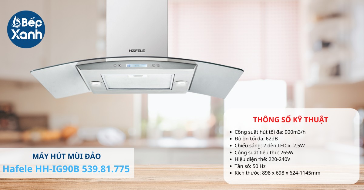 Máy hút mùi đảo HH-IG90B Hafele 539.81.775 là dạng máy hút mùi độc lập được lắp đặt treo trên trần kết hợp với mặt kính cong sẽ mang đến một thiết kế nổi bật tạo điểm nhấn cho không gian bếp thêm sang trọng, hiện đại. Thiết bị được sản xuất tại Ba Lan với hệ thống điều khiển bằng nút nhấn điện tử kết hợp màn hình LCD, đây sẽ là một thiết bị hút mùi thông minh và tiện lợi cho người dùng.