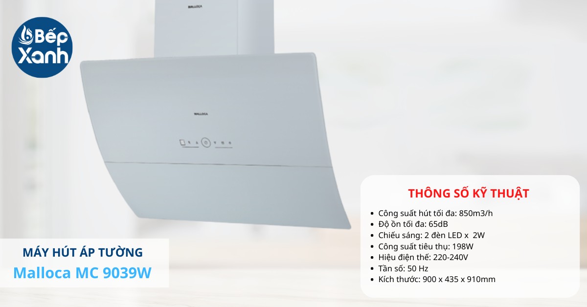 Máy hút mùi áp tường Malloca MC 9039W có thiết kế độc đáo với hình dạng kính vát màu trắng mang đến sự nổi bật cho không gian bếp, tạo điểm nhấn cho một căn bếp sang trọng. Với trang bị điều khiển cảm ứng cùng với remote điều khiển từ xa, màn hình LED hiển thị đã đem tới một sản phẩm vô cùng hiện đại và tiện lợi cho người dùng.