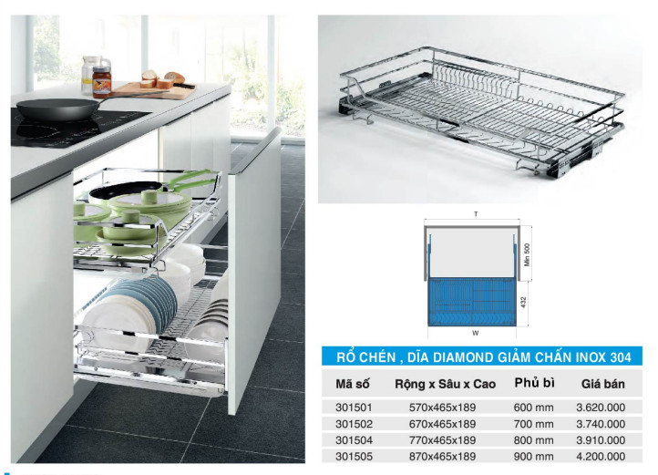 Rổ chén dĩa diamond giảm chấn inox 304: