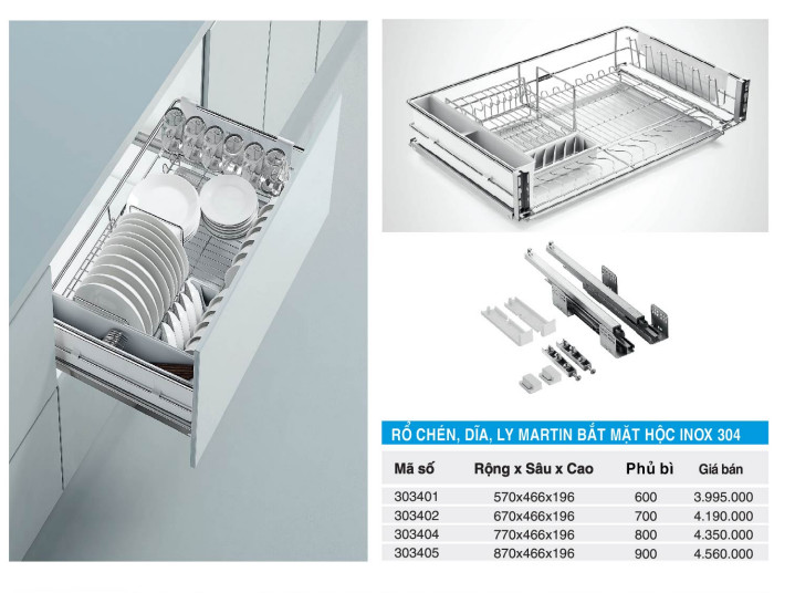 Rổ chén, dĩa, ly Martin bắt mặt hộc inox 304: là vật dụng không thể thiếu trong gia đình và qua thời gian thì chắc chắn số lượng chén bát, ly tách sẽ dần dần tăng lên nhất là đối với những người có sở thích sưu tầm chúng. Để giải quyết vấn đề lưu trữ chén bát, ly tách mà không làm mất thẩm mỹ căn bếp, không gây ảnh hưởng đến chất lượng của chúng, tránh xa tầm tay của trẻ em, những thứ không mong muốn thì rổ đựng chén bát âm tủ là một giải pháp tuyệt vời nhất. Với thiết kế kháng chấn, ray trượt đưa rổ inox ra ngoài tủ một cách nhẹ nhàng sẽ khiến bạn cảm thấy thật an tâm để chén bát sứ của mình không bị sứt mẻ.
