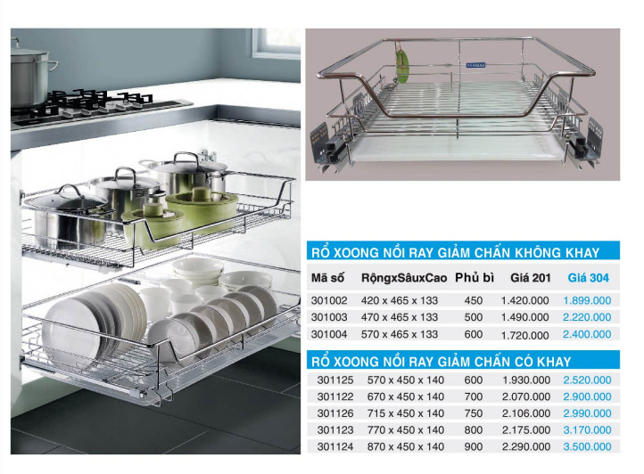 Là phụ kiện không thể thiếu trong tủ bếp dưới của mỗi gia đình, thiết kế các thanh inox tròn song song chắc chắn, bạn có thể để nồi nêu xoong chảo thoải mái mà không cần bận tâm hay lo lắng nó sẽ bị hỏng, sập xệ.