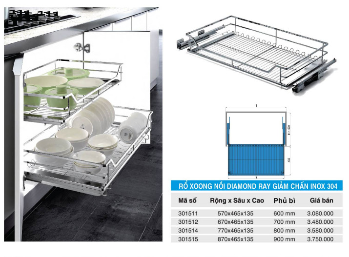 Rổ xoong nồi diamond ray giảm chấn inox 304: thiết kế ngăn để chén dĩa riêng biệt dễ dàng khi cất giữ và lấy, kết hợp với ray giảm chấn, an toàn khi đóng mở tủ mà không gây đổ vỡ chén bát và hỏng khoang tủ bếp. Cùng với vẻ đẹp tinh tế, đơn giản giúp căn bếp bạn vừa tiện nghi vừa sang trọng.