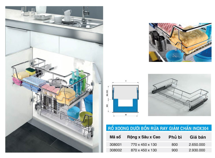 Rổ xoong nồi dưới bồn rửa ray giảm chấn inox 304: được thiết kế với kiểu dáng hết sức đẹp mắt, tận dụng toàn bộ không gian bên trong tủ phía dưới bồn rửa. Bạn có thể tiện lợi cất giữ nước rửa chén, miếng rửa chén, khăn lau bếp, ống lọc bồn rửa… mà không cần phải đi đâu xa cất giữ hay tìm kiếm chúng mỗi lần phải rửa chén, lau chùi mọi thứ trong bếp.