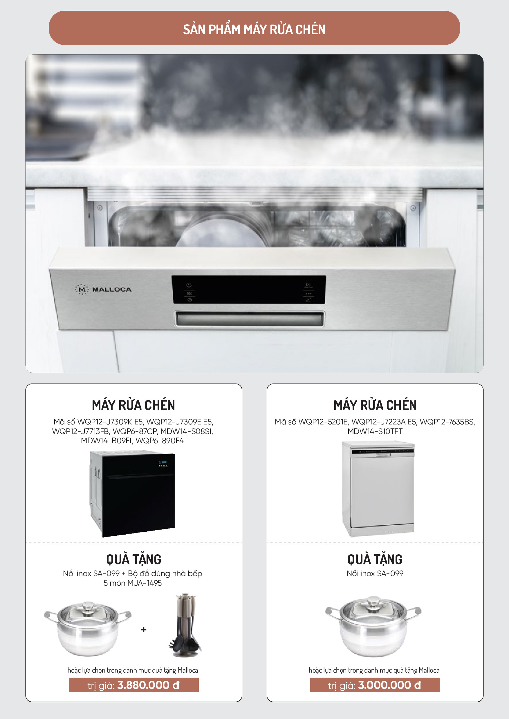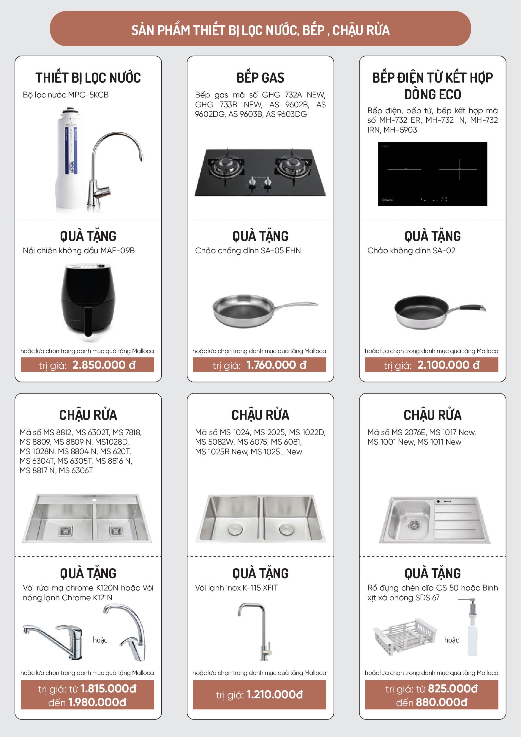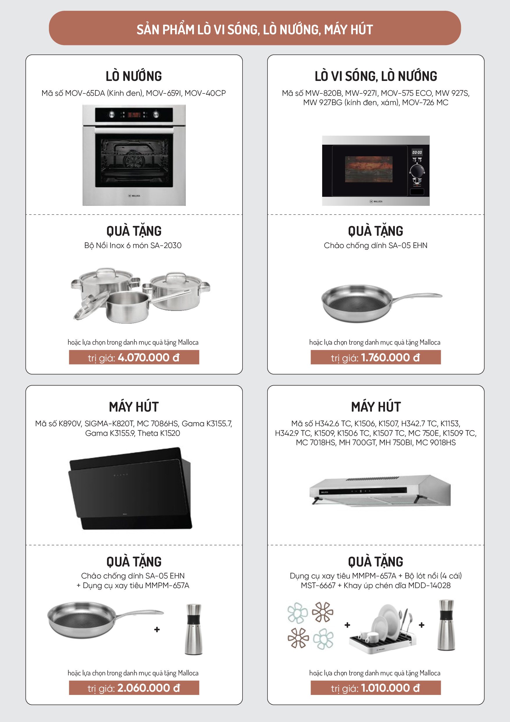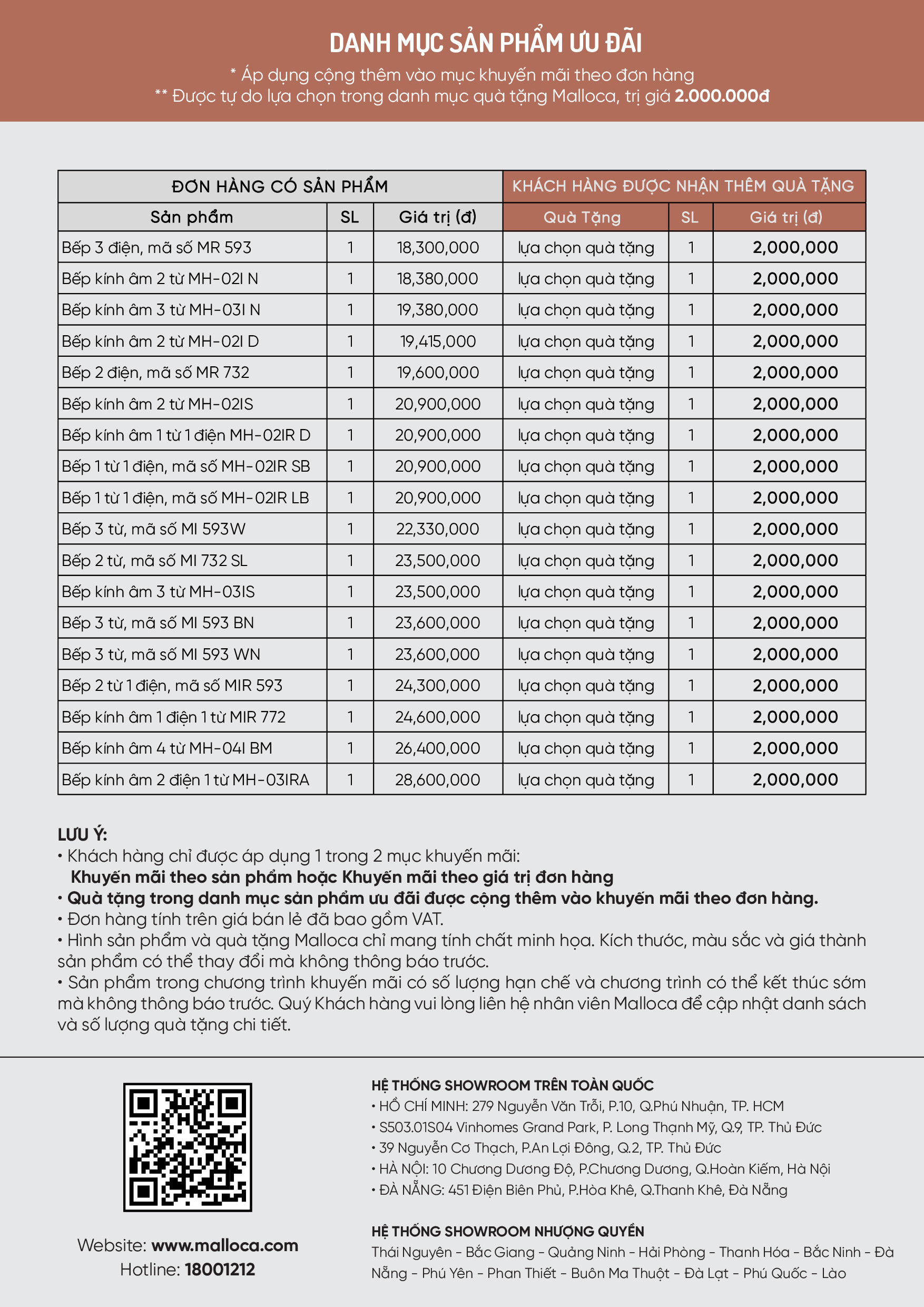 Theo đó, khi mua các sản phẩm của hãng bếp Malloca trong chương trình khuyến mãi, khách hàng sẽ nhận được quà tặng với nhiều trị giá khác nhau. Khách hàng lựa chọn 1 trong 2 mục khuyến mãi A - theo sản phẩm hoặc B - theo giá trị đơn hàng. Ngoài ra, khi mua các sản phẩm bếp điện từ trong danh mục, khách hàng sẽ được nhận thêm quà tặng trị giá 2.000.000đ (áp dụng cộng thêm cho khuyến mãi B-theo giá trị đơn hàng).