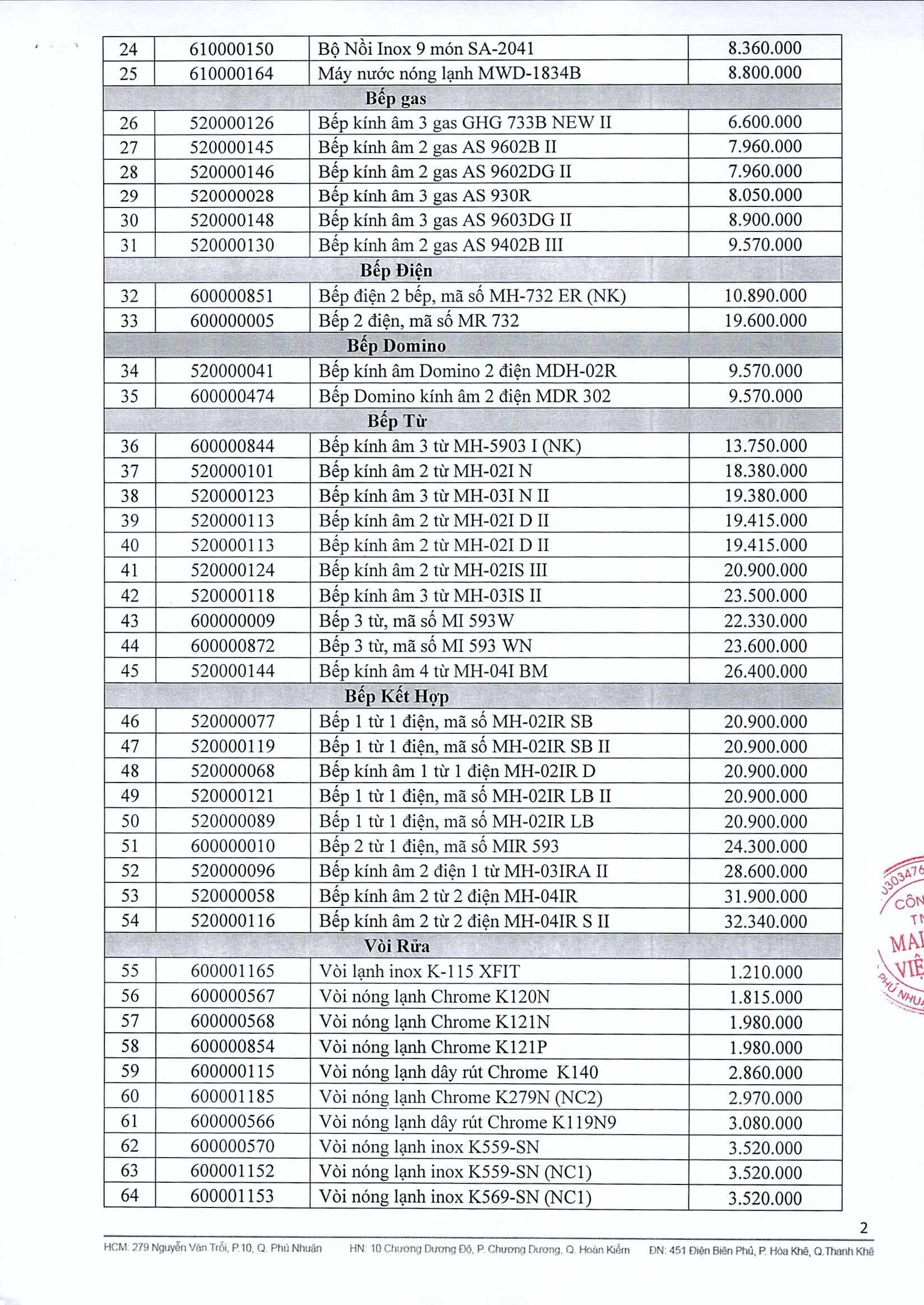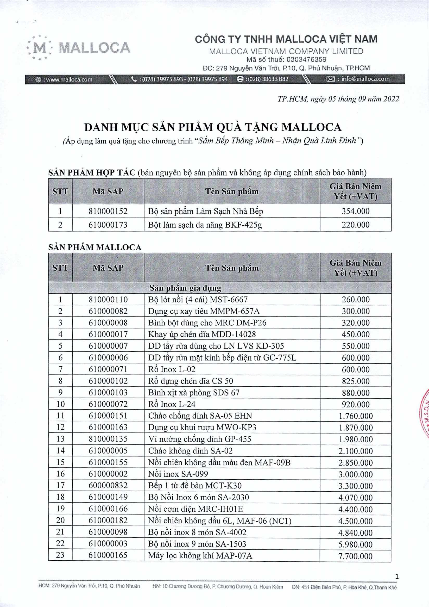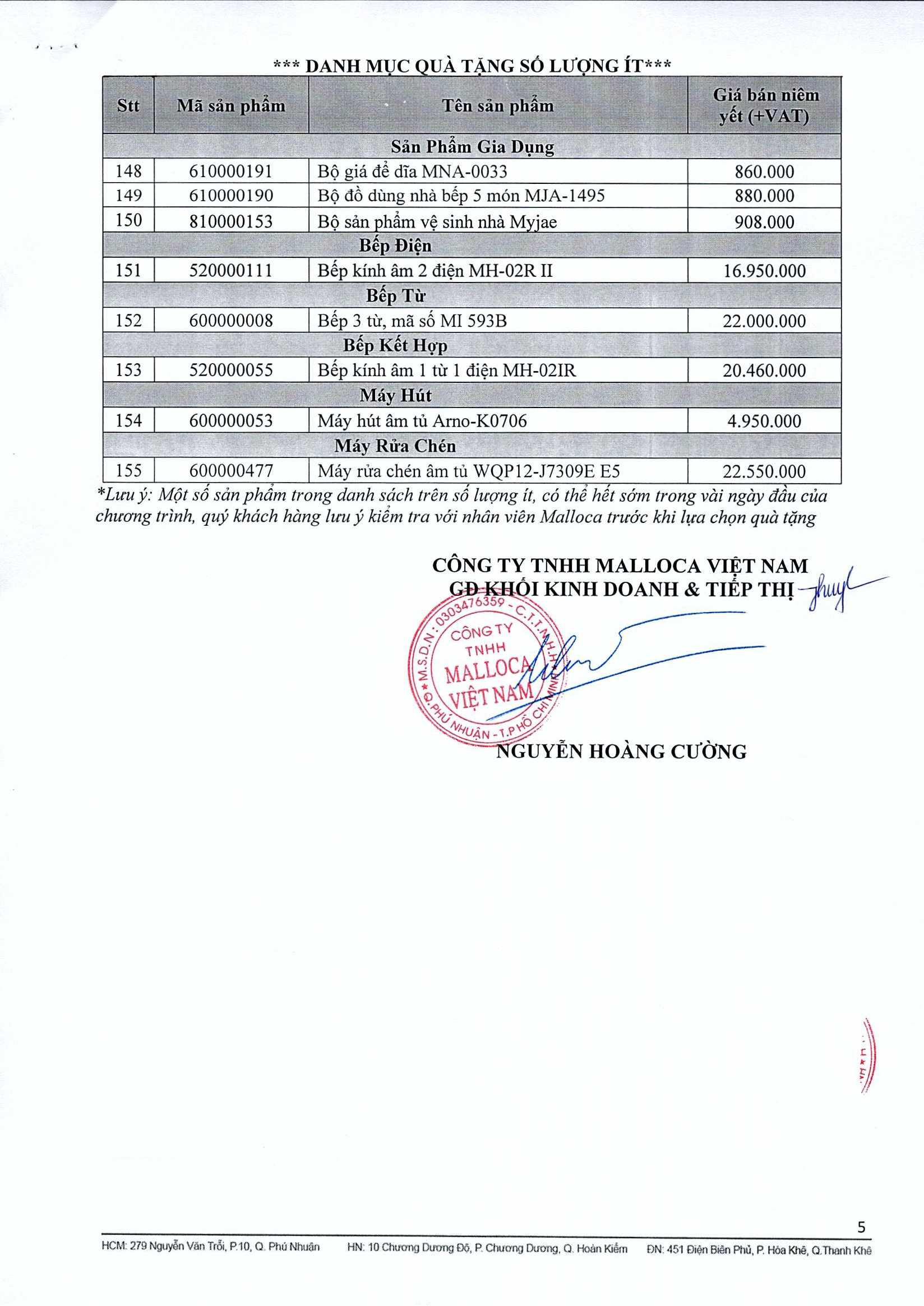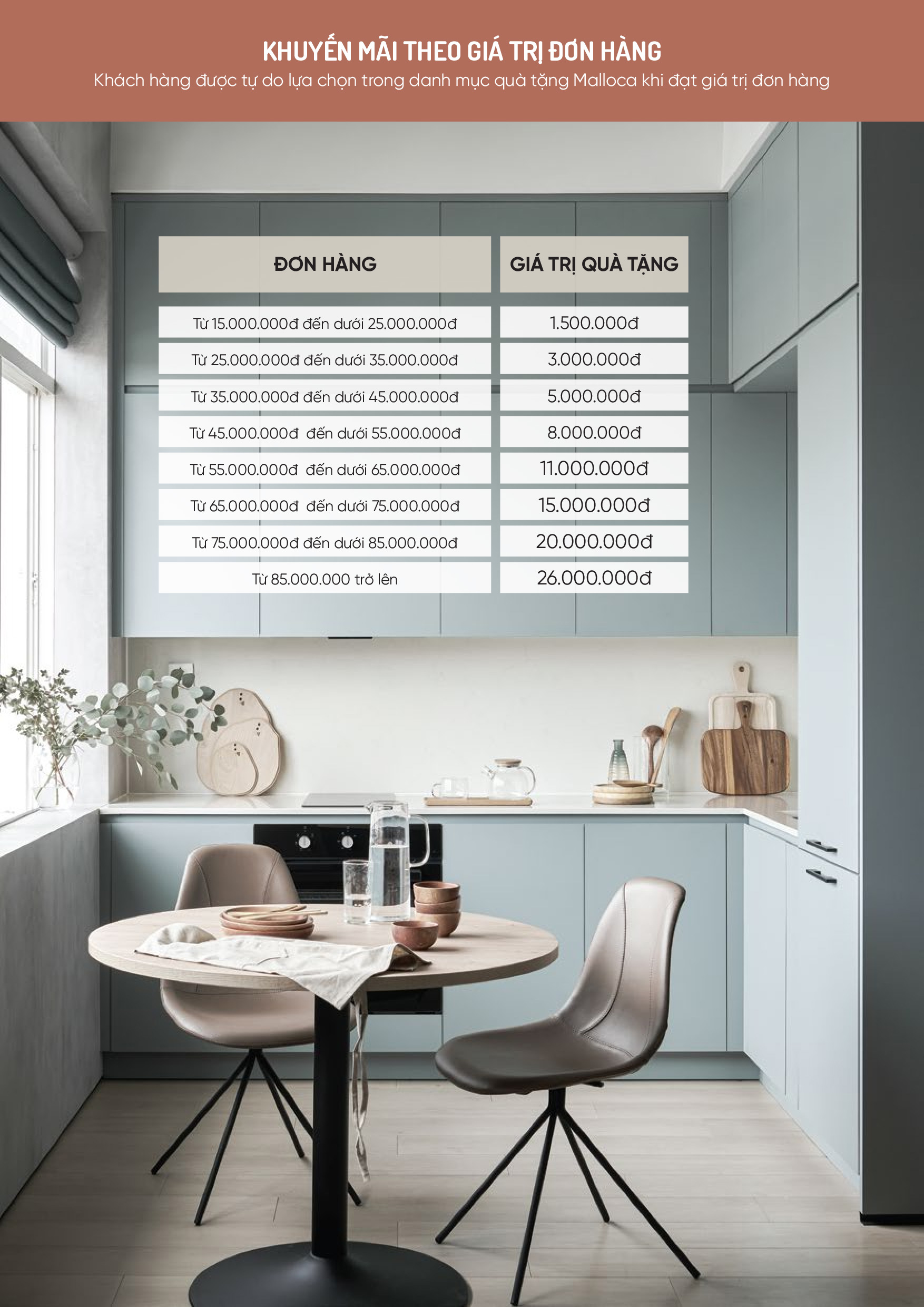 Theo đó, khi mua các sản phẩm của hãng bếp Malloca trong chương trình khuyến mãi, khách hàng sẽ nhận được quà tặng với nhiều trị giá khác nhau. Khách hàng lựa chọn 1 trong 2 mục khuyến mãi A - theo sản phẩm hoặc B - theo giá trị đơn hàng. Ngoài ra, khi mua các sản phẩm bếp điện từ trong danh mục, khách hàng sẽ được nhận thêm quà tặng trị giá 2.000.000đ (áp dụng cộng thêm cho khuyến mãi B-theo giá trị đơn hàng).
