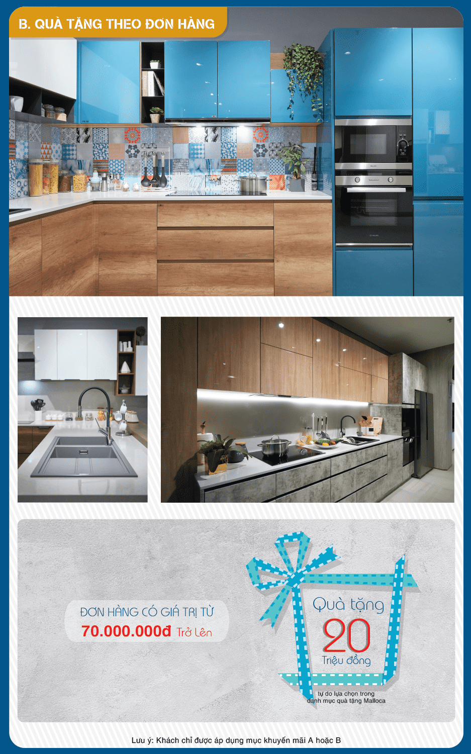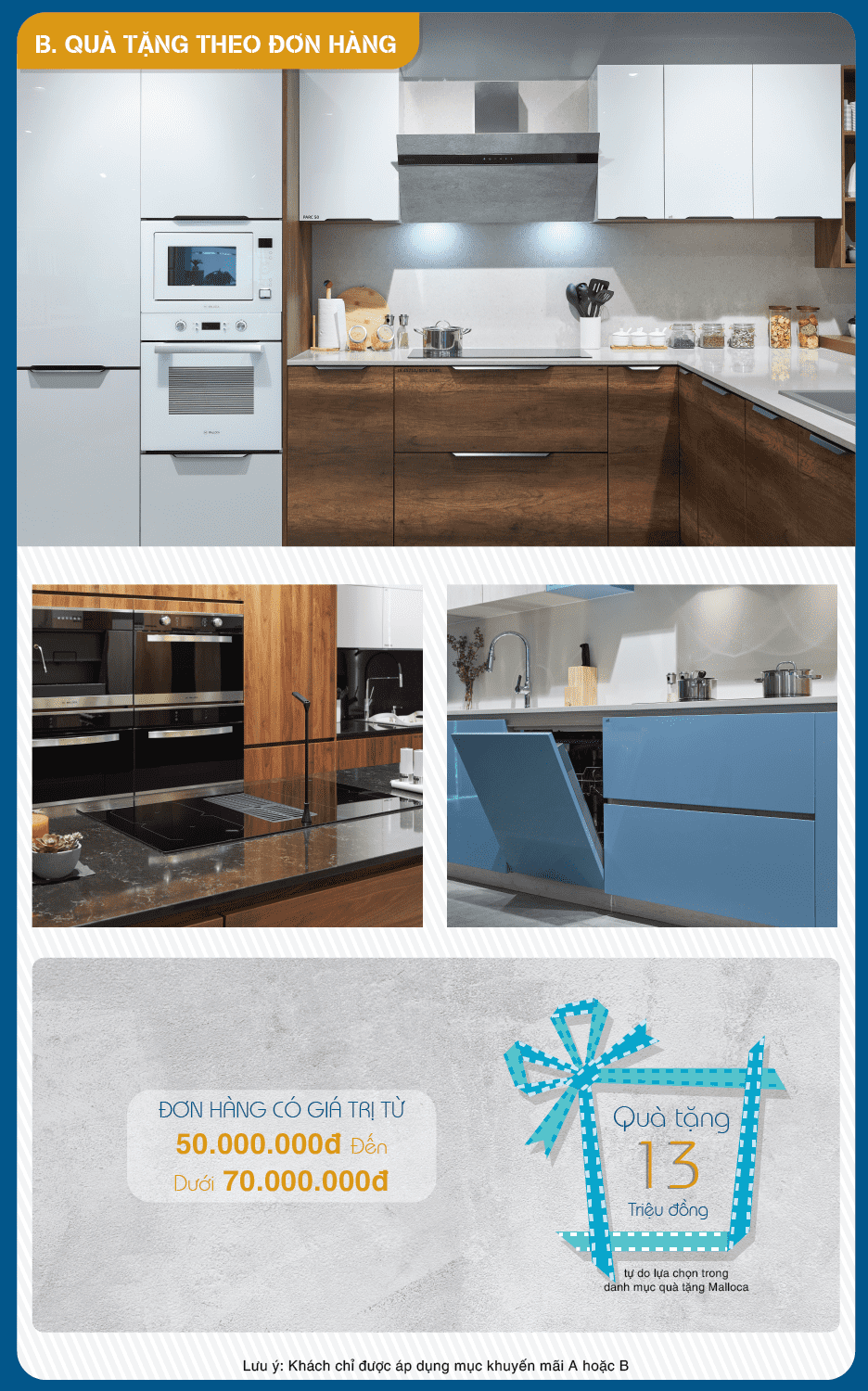 Theo đó, khi mua máy hút mùi, bếp điện từ, lò nướng, chậu rửa chén,...cùng các sản phẩm khác trong danh mục khuyến mãi, khách hàng sẽ nhận được quà tặng với nhiều trị giá khác nhau. Khách hàng lựa chọn 1 trong 2 mục khuyến mãi A- theo sản phẩm hoặc B-theo đơn hàng.