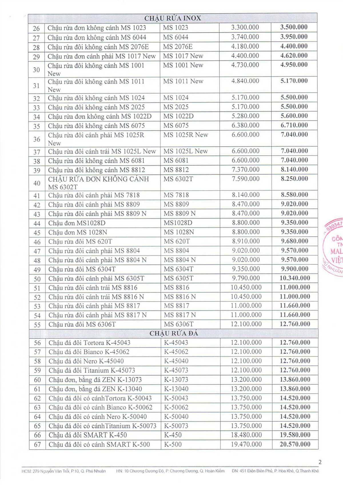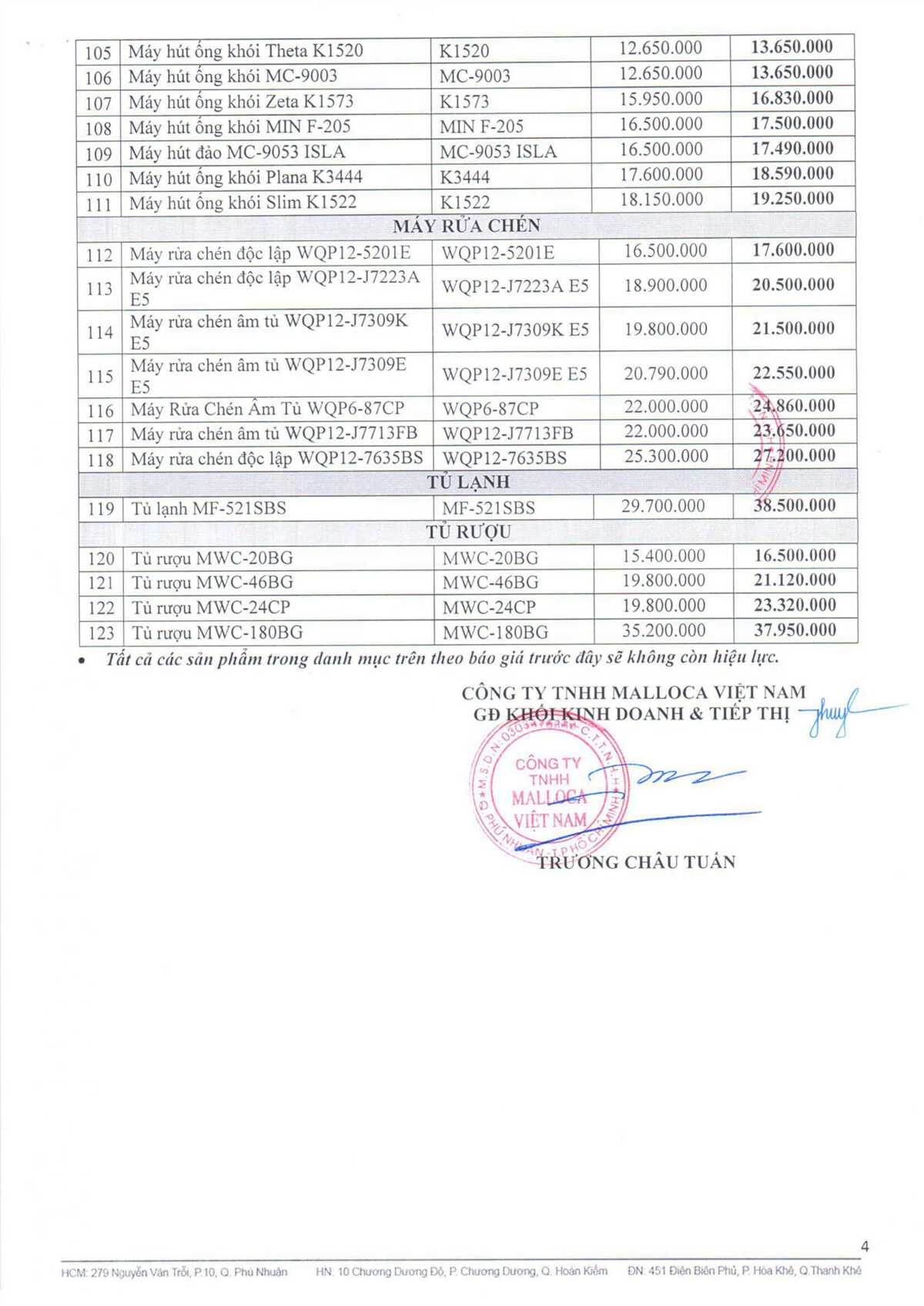 Thông báo đổi giá sản phẩm Malloca 2021
