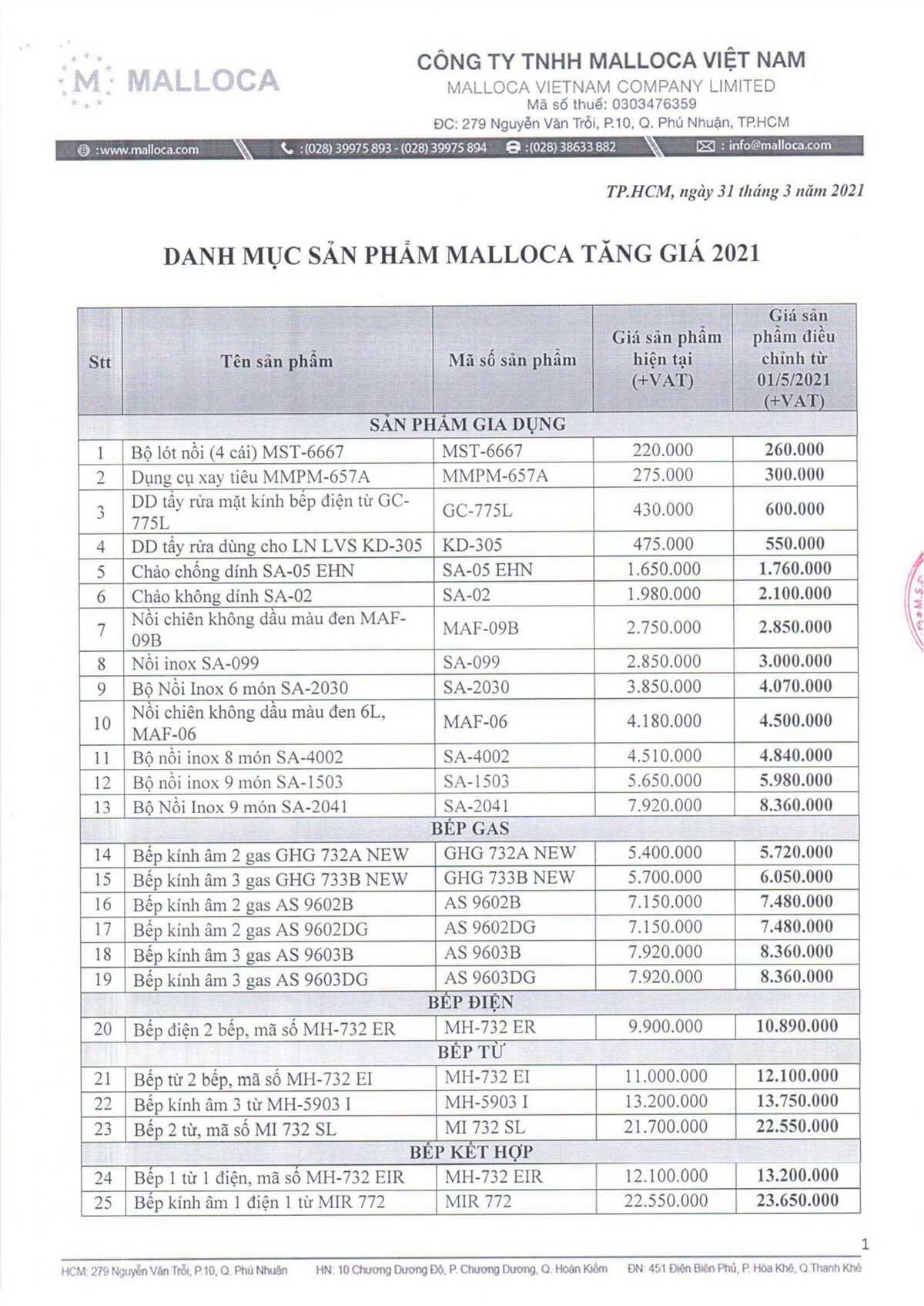 Thông báo điều chỉnh giá bán sản phẩm Malloca có hiệu lực kể từ ngày 01/05/2021.
