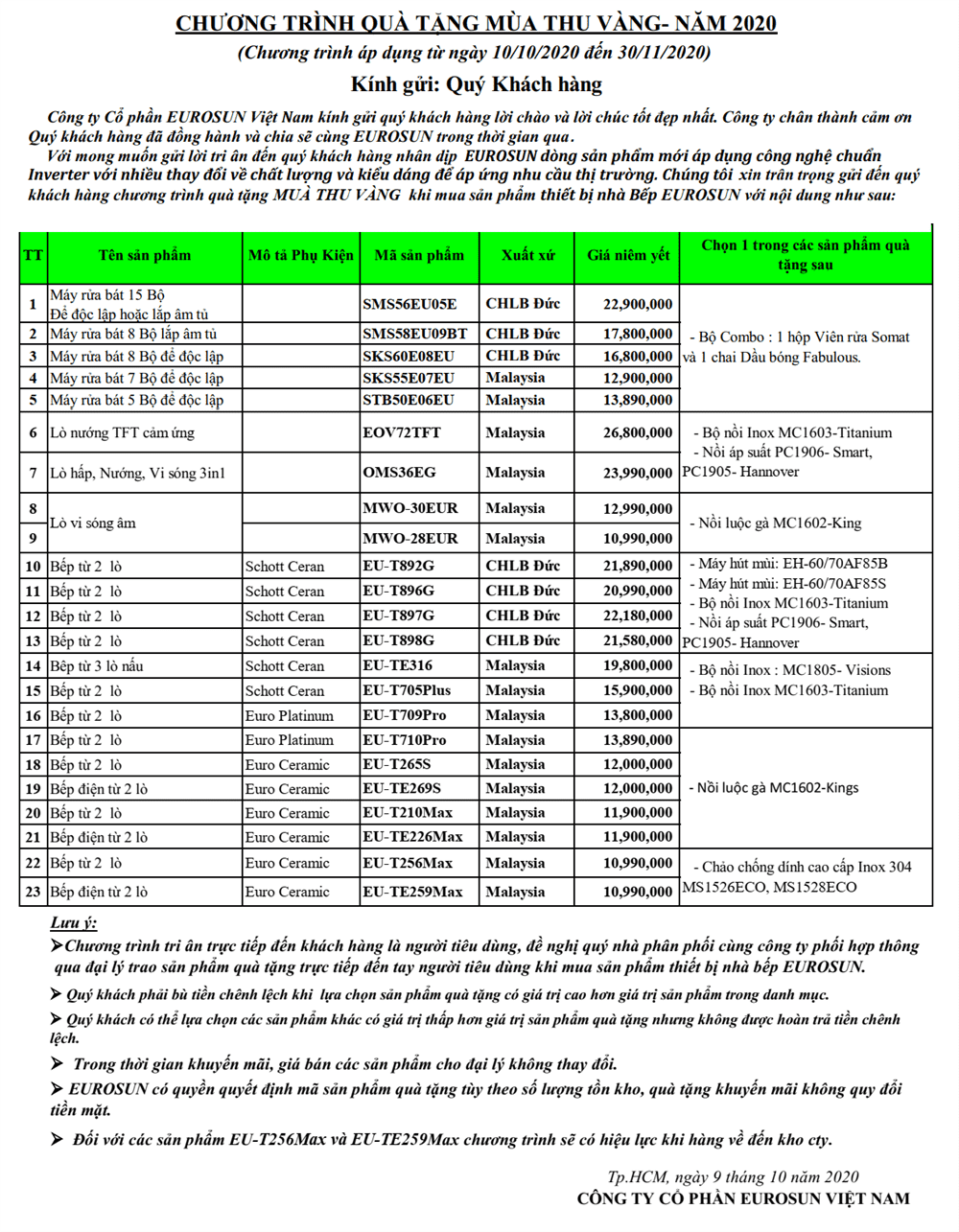 Thông báo trương trình khuyến mãi "Mùa thu Vàng Eurosun" từ 10.10 đến 30.11.2020