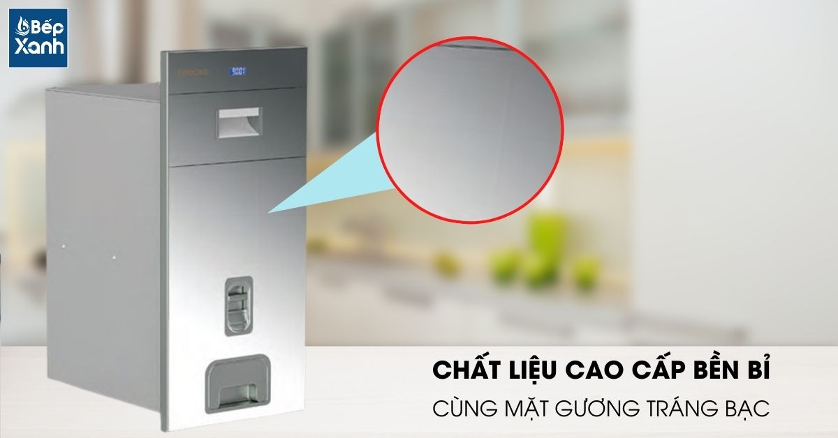 Thùng gạo điện tử Eurogold B301 có thiết kế bề mặt gương tráng bạc sáng bóng giúp tô điểm thêm cho không gian bếp của gia đình. Kiểu dáng lắp âm tủ tiết kiện diện tích và tận dụng tối đa những không gian bếp nhỏ. Ngoài ra, sản phẩm còn có cấu tạo nắp khép kín giúp tránh tình trạng ẩm mốc và côn trùng xâm nhập.