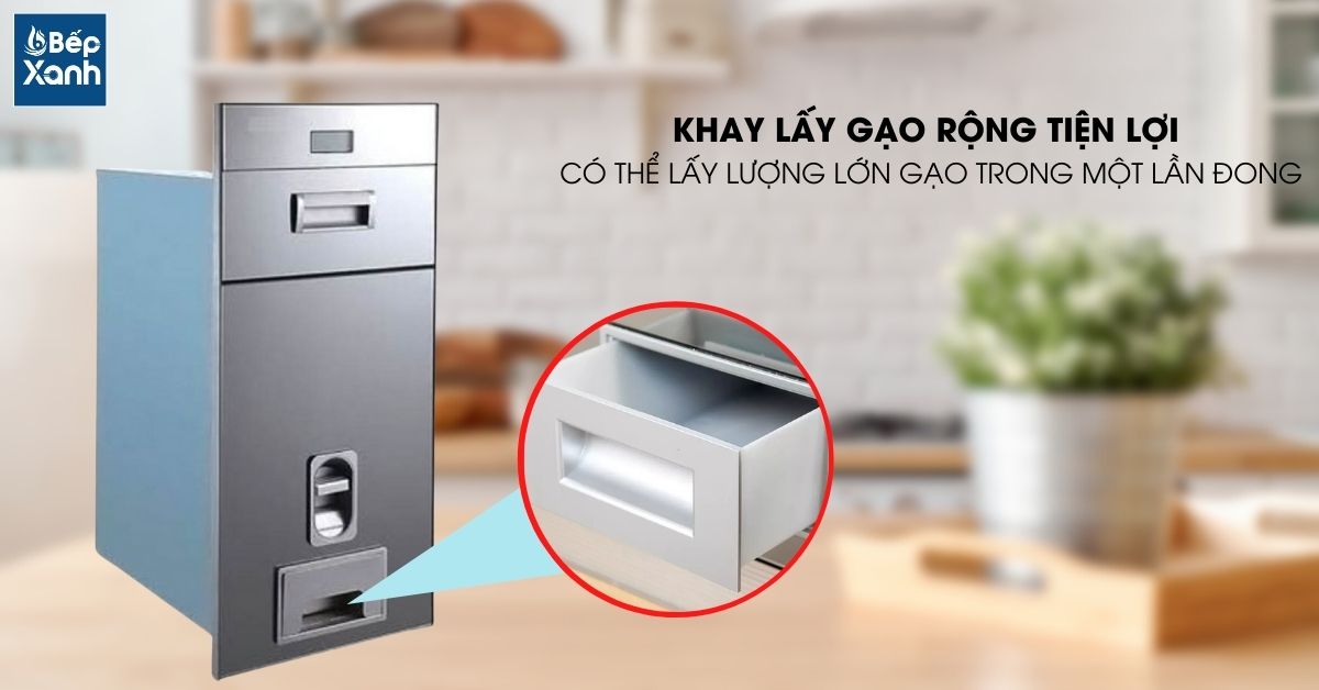 Sản phẩm được trang bị khay lấy hứng gạo ngay sau khi lấy ở phía trước thùng gạo. Nếu như trước kia bạn thường phải đong gạo bằng ca nên mỗi khi lấy gạo phải cúi người xuống lấy, với tay vào trong thùng và phải đong nhiều lần thì bây giờ với thùng gạo thông minh B301 bạn có thể lấy 600g gạo/1 lần đong.