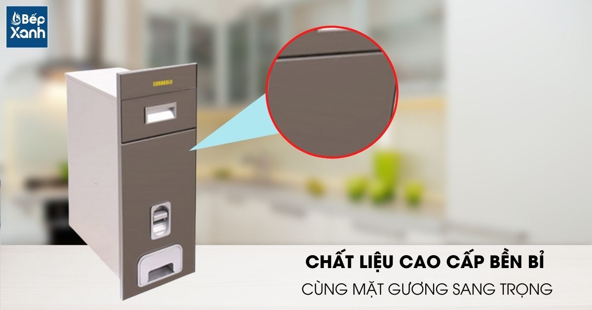 Thùng gạo âm tủ Eurogold B25 có thiết kế bề mặt gương sáng bóng giúp không gian bếp thêm phần hiện đại hơn. Kiểu dáng lắp âm tủ hoàn toàn giúp tiết kiệm tối đa không gian bếp, đặc biệt là các không gian bếp nhỏ. Sản phẩm kết hợp thêm ray giảm chấn làm giảm tiếng ồn khi kéo ra. Bạn chỉ cần kéo nhẹ là đã đưa toàn bộ thùng gạo ra phía ngoài một cách dễ dàng.