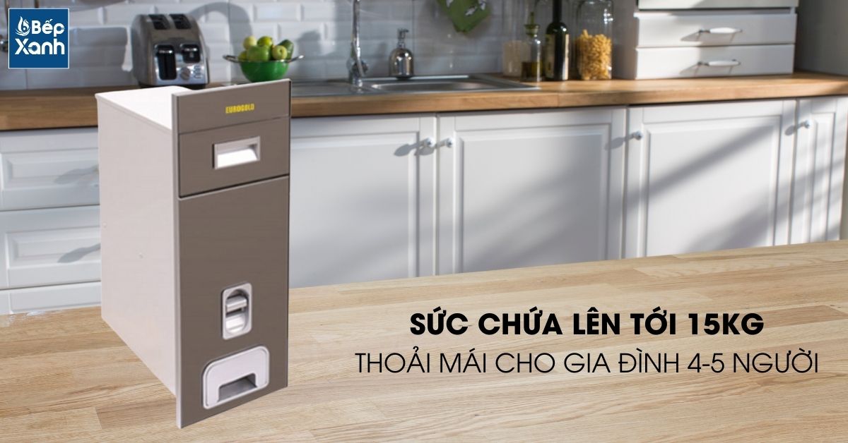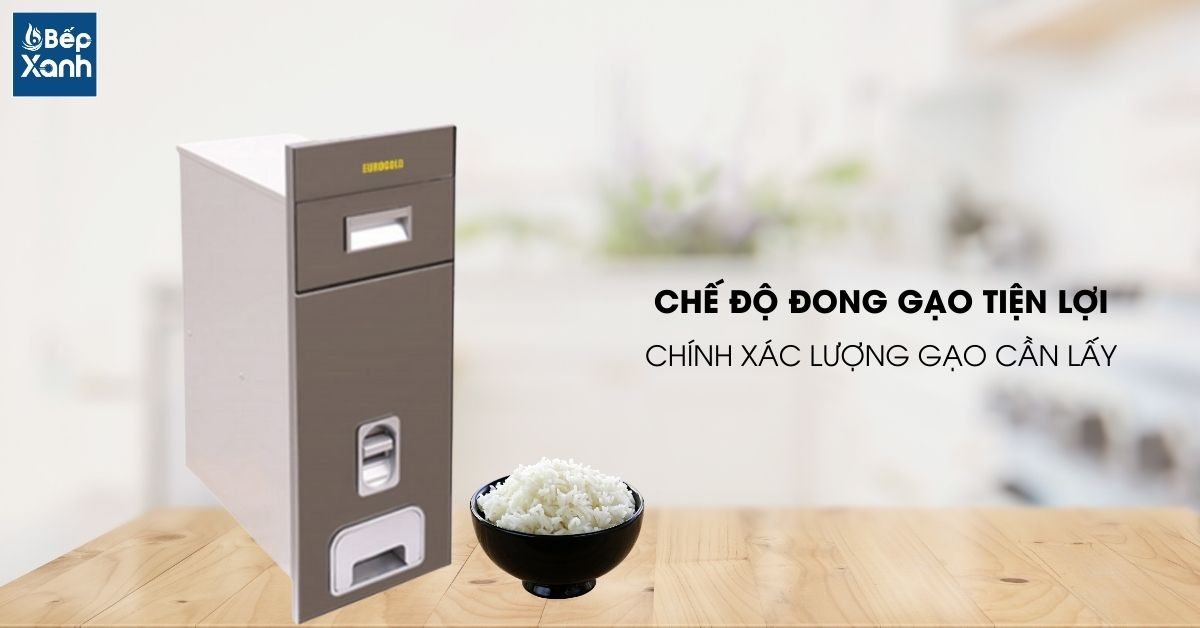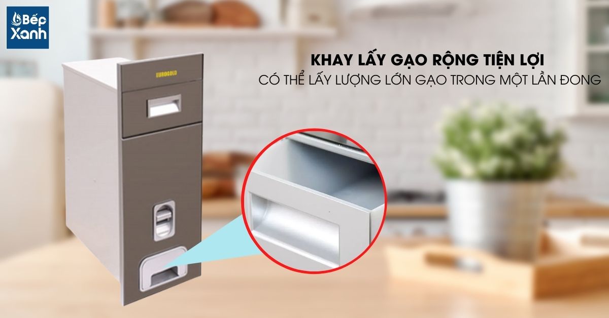 Thùng gạo tráng gương Eurogold B25 còn có thêm khay hứng gạo rộng rãi ở phía trước thùng gạo. So với thùng gạo thông thường thì bạn cần phải đong gạo bằng ca và cúi người xuống khi lấy gạo, giờ đây đối với thùng gạo B25 bạn có thể lấy 600g gạo/1 lần đong, không cần phải đong nhiều lần như trước nữa.