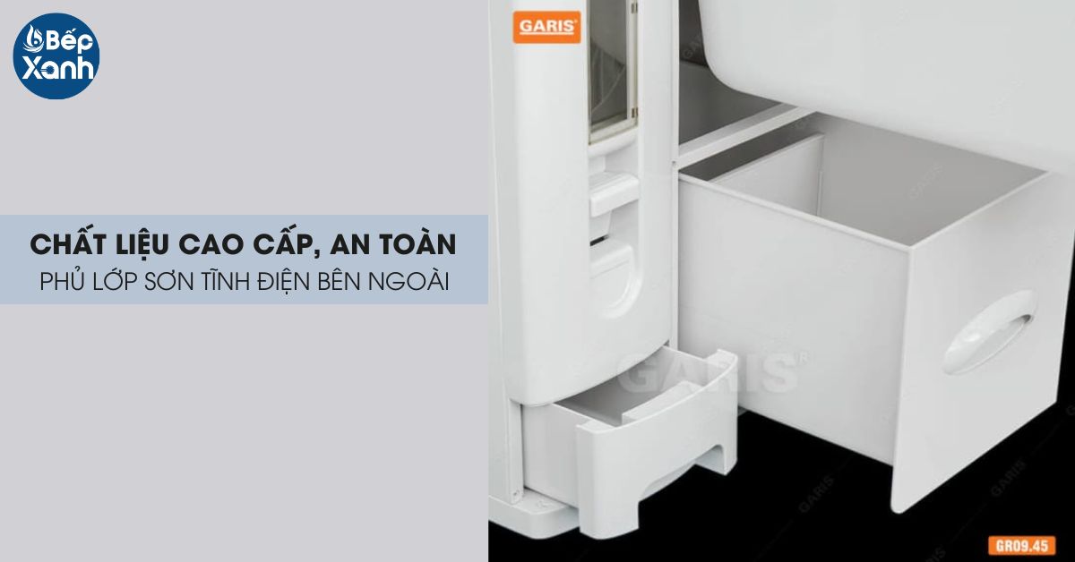 Thùng gạo thông minh 3 khoang Garis GR09.45 được làm từ chất liệu thép cao cấp sơn tĩnh điện nhằm tăng độ bền cho sản phẩm. Phần mặt bên ngoài của thùng gạo được làm từ nhựa ABS cao cấp giúp cho sản phẩm tăng khả năng chống chịu lực tốt hơn.