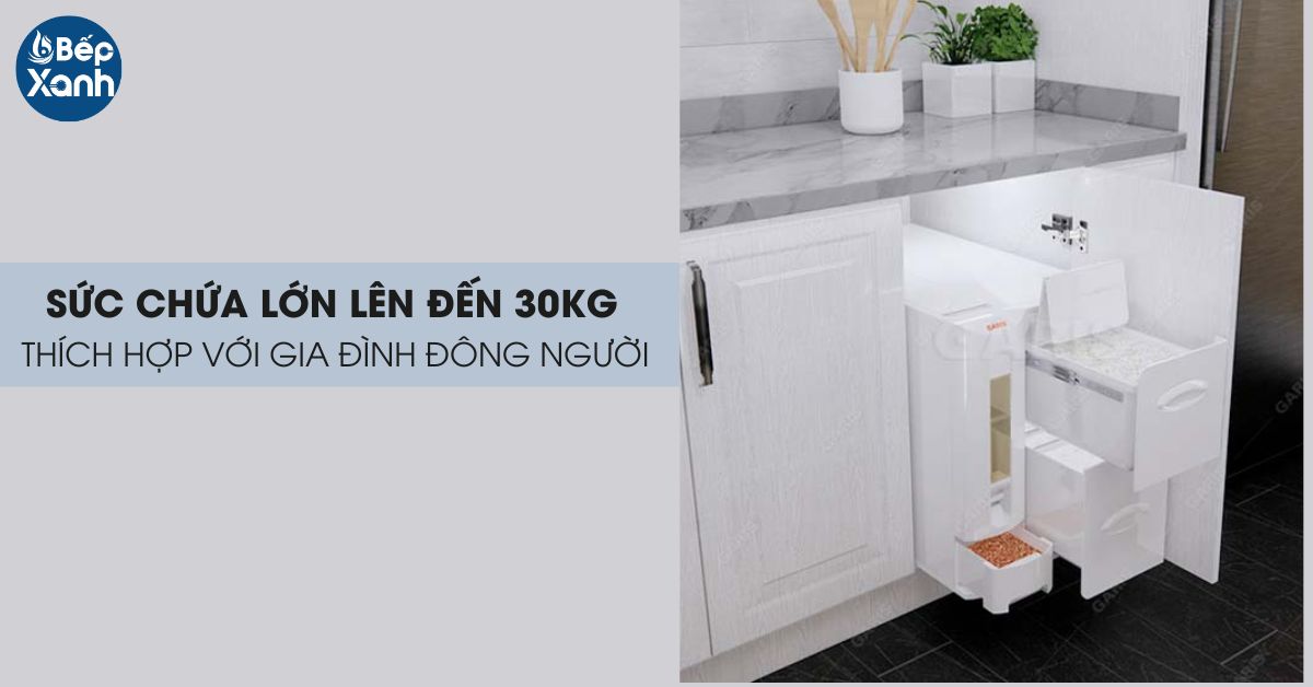 Mặc dù có thiết kế nhỏ gọn nhưng thùng gạo lắp âm GR09.45 có sức chứa lên tới 30kg gạo, đây là tải trọng ấn tượng, gấp đôi so với sức chứa của những sản phẩm cùng loại khác. Với sức chứa gạo như trên, thùng gạo thông minh phù hợp để chứa lượng gạo đủ cho những gia đình đông người từ 6-7 thành viên sử dụng trong 2-4 tháng.