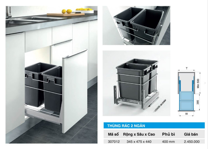 Thùng rác 2 ngăn: thiết kế âm tủ bếp, có bộ ray trượt giảm chấn giúp thao tác đóng mở nhẹ nhàng khi dùng đến thùng rác. Với thiết kế này bạn có thể tận dụng được khoảng trống dưới bồn rửa để lắp đặt nhằm tiết kiệm không gian bếp. Được làm bằng chất liệu nhựa cao cấp, chịu lực tốt, thiết kế 2 ngăn cho bạn phân loại rác vô cơ và hữu cơ, giúp bạn chứa được khối lượng lớn rác thải lớn và dễ dàng lấy rác ra khỏi thùng để làm vệ sinh.
