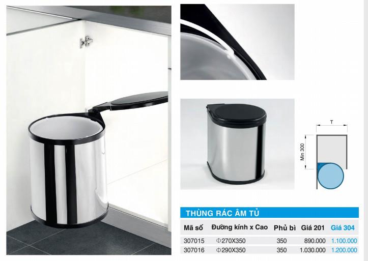 Thùng rác âm tủ bếp: bên ngoài làm bằng inox cao cấp tạo cảm giác sạch bóng; bên trong là thùng chứa bằng nhựa cao cấp dễ dàng lấy ra, vào; nắp đậy bằng nhựa kín đáo, vừa khít. Thùng rác được gắn cố định lên cánh cửa tủ, bạn chỉ cần động tác mở tủ là có thể đưa thùng rác ra ngoài sử dụng thuận tiện.
