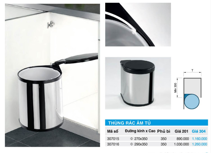 Thùng rác âm tủ bếp: bên ngoài làm bằng inox cao cấp tạo cảm giác sạch bóng; bên trong là thùng chứa bằng nhựa cao cấp dễ dàng lấy ra, vào; nắp đậy bằng nhựa kín đáo, vừa khít. Thùng rác được gắn cố định lên cánh cửa tủ, bạn chỉ cần động tác mở tủ là có thể đưa thùng rác ra ngoài sử dụng thuận tiện.