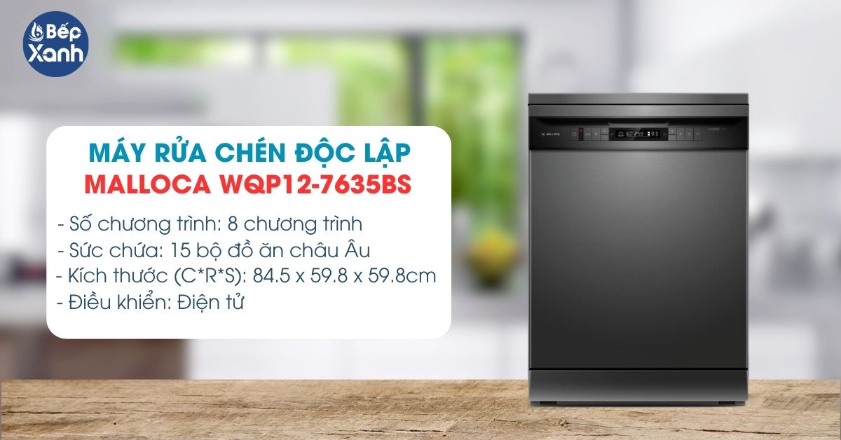 Một mẫu rửa chén độc lập khác được người dùng đánh giá cao trong top máy rửa bát tốt nhất là Malloca WQP12-7635BS. Sản phẩm có dạng thùng cứng cáp, gam đen sang trọng dễ phối, bố trí đơn giản. Đây là lựa chọn cho các không gian bếp rộng rãi, có thể đặt có bất cứ đâu trong căn bếp nhằm tạo sự nổi bật và hiện đại cho không gian. Máy có sức chứa 15 bộ chén đĩa châu Âu thoải mái rửa lượng bát đĩa lớn hoặc các bữa tiệc gia đình.