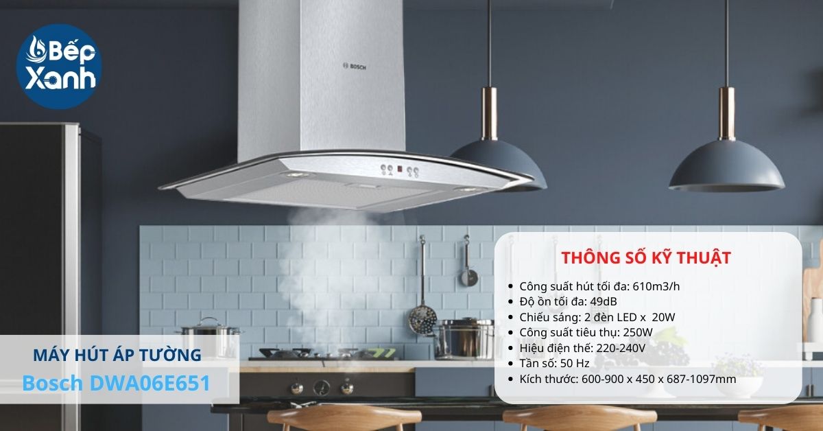 Tiếp theo là một sản phẩm sẽ tô điểm cho không gian bếp nhà bạn thêm phần hiện đại là máyhút mùi kính cong Bosch DWA06E651. Sản phẩm được nhập khẩu nguyên chiếc từ Ba Lan với mặt kính cong góp phần tạo nên sự sang trọng, thẩm mỹ cho không gian. Kích thước máy nhỏ gọn với chiều ngang 60cm cùng với việc được lắp đặt áp sát tường nên mang đến sự rộng rãi, thoáng mát. Máy được làm bằng chất liệu thép không gỉ nên có độ bền cao, chịu nhiệt tốt giúp bạn an tâm về chất lượng khi sử dụng.