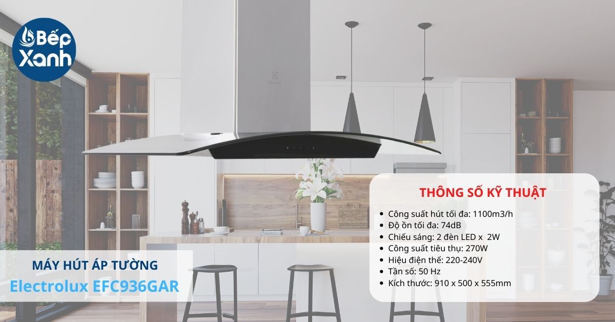 Máy hút mùi kính cong Electrolux EFC936GAR có thiết kế trang nhã với phần vỏ ngoài bằng thép không gỉ mang lại vẻ sáng bóng, không bám bẩn dễ dàng lau chùi. Chiều ngang máy 90cm dễ lắp đặt, được trang bị động cơ đơn vận hành mạnh mẽ với công suất hút lên đến 1100m3/h với 3 tốc độ hút cho người dùng lựa chọn sẽ là sản phẩm lý tưởng cho các không gian bếp lớn, rộng rãi.