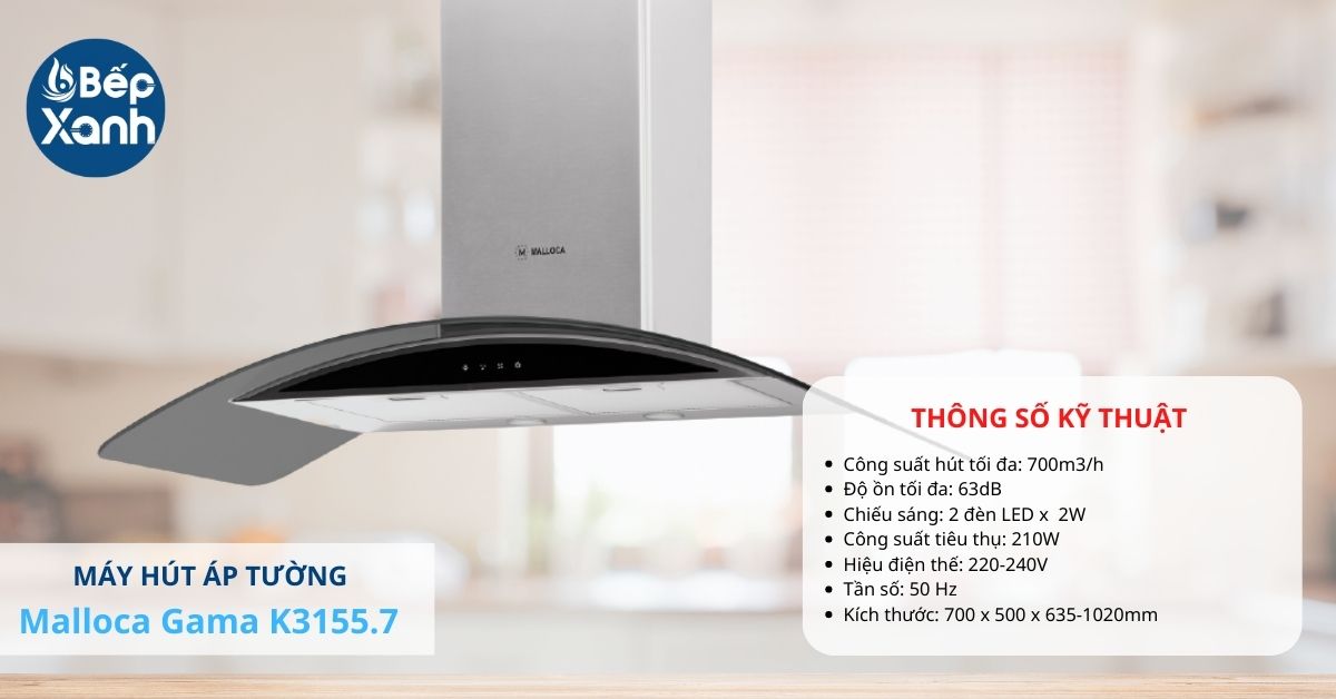 Sản phẩm được trang bị động cơ tuabin đôi mang nên mang lại công suất hút cho máy cao lên đến 700m3/h, với công suất hút mạnh mẽ với 3 tốc độ hút cho người dùng điều chỉnh để phù hợp cho mọi loại thức ăn. Nhờ đó mà máy hút mùicó thể đảm bảo hiệu quả khử mùi cao và tối ưu nhất cho căn bếp. Các sản phẩm máy hút mùi của Malloca thường kiểm soát tiếng ồn rất tốt và Malloca Gama K3155.7 cũng không ngoại lệ khi tiếng ồn tối đa chỉ 63dB, hoạt động rất êm ái.