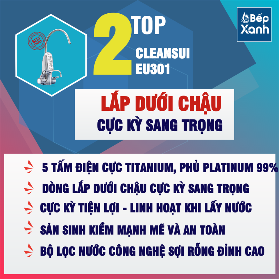 Máy lọc nước điện giải Cleansui EU301 là sản phẩm máy lọc nước điện giải của tập đoàn danh tiếng Chemical Cleansui. Đây là thương hiệu sở hữu công nghệ lọc nước ứng dụng màng sợi rỗng tiên phong, chiếm thị phần số 1 tại thị trường Nhật Bản. Công nghệ màng lọc sợi rỗng được chính phủ Nhật Bản ứng dụng để đem đến nguồn nước sạch, an toàn và hoàn toàn không còn chất độc hại cho hàng triệu gia đình tại các thành phố của Nhật. Cleansui EU301 là dòng máy lọc nước điện giải lắp dưới chậu duy nhất được khách hàng đánh giá cao, tiện dụng và mạnh mẽ nhất. Máy có 5 tấm điện cực Titanium phủ Platinum, sử dụng bộ vòi cao cấp tích hợp lắp tại chậu, bảo hành lên đến 5 năm. Chính vì vậy, máy được nhiều khách hàng đánh giá cao, và là dòng máy lọc nước điện giải ion kiềm lắp dưới chậu bán chạy nhất hiện nay tại Việt Nam.