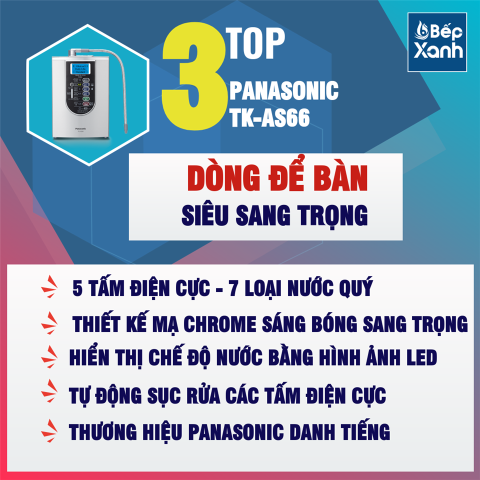 Máy tạo điện giải Panasonic TK-AS66 là dòng máy điện giải nổi danh của tập đoàn Panasonic tại Việt Nam. Máy được thiết kế vô cùng sang trọng, với bề mặt phủ chrome sáng bóng đem đến cảm nhận hiện đại và tinh tế. Với 7 loại nước có thể lấy được, bao gồm dải PH từ PH 3.0 đến PH 10.0, thoải mái trong các nhu cầu sử dụng nước hàng ngày. Điều đặc biệt gây ấn tượng cho khách hàng, đó là máy có chế độ hiển thị bằng màn hình Led, biểu thị mức PH khách hàng đang lấy và các cảnh báo mức nước không uống được (Màu xanh - Uống được, màu đỏ hoặc cam - Không uống được). Chức năng điều khiển dễ dàng, kèm bộ lọc lên đến 12.000L đem đến sự an tâm và hài lòng cho khách hàng. Điều này giúp Panasonic TK-AS66 ghi điểm, giúp sản phẩm trở thành một trong các dòng máy lọc nước điện giải ion kiềm bán chạy nhất.
