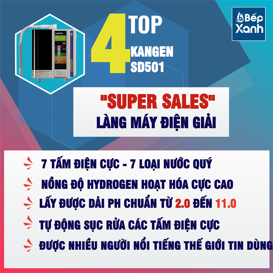Nhắc đến dòng máy điện giải Kangen, ai cũng biết đến dòng Kangen SD501. Đây là dòng máy được "cả thế giới biết đến", là sản phẩm bán chạy của tập đoàn Enagic (Enagic là tập đoàn sản xuất máy Kangen). Không thể phủ nhận một điều, máy được ưa chuộng bởi cả những người nổi tiếng trên thế giới, các chính trị gia, các ngôi sao giải trí hàng đầu của Mỹ đều sử dụng. Đây là dòng máy có 7 tấm điện cực, cho ra 7 loại nước quý và điều đặc biệt, giá thành cũng tương đối dễ chịu: 106.000.000đ. Chính nhờ sự mạnh mẽ, khả năng chống oxy hóa cao cũng như dễ dàng điều khiển, Kangen SD501 đem đến giải pháp sử dụng máy điện giải ion kiềm cao cấp nhưng giá thành cực kỳ hợp lý.