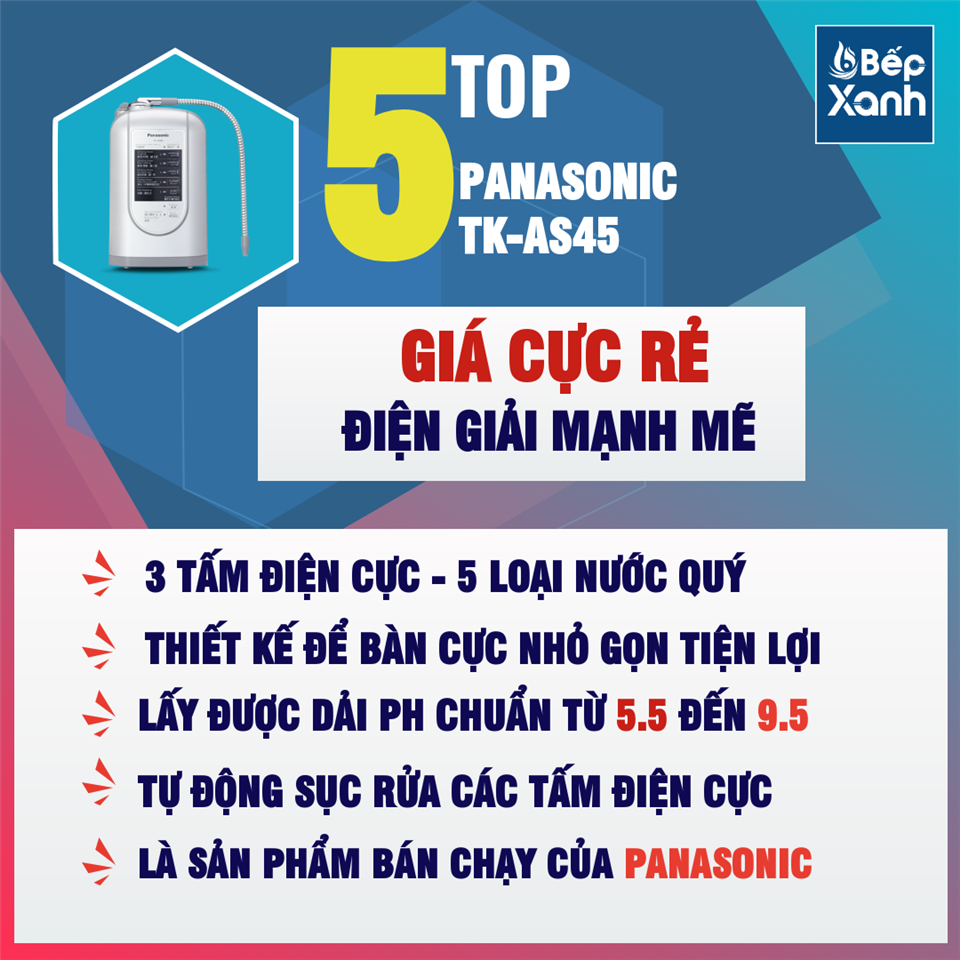 Panasonic hiện nay có 3 dòng máy lọc nước điện giải ion kiềm đang được bán chính thức tại Việt Nam. Trong đó dòng máy lọc nước Panasonic TK-AS45 là dòng máy nhỏ gọn và tiện lợi nhất mà hãng đem đến cho thị trường Việt Nam. Với thiết kế nhỏ gọn, 3 tấm điện cực tạo ra 5 loại nước PH khác nhau, giúp người sử dụng dễ dàng có thể lấy được các mức nước PH linh hoạt và an toàn nhất. Máy có giá bán chỉ 25.500.000đ, đem đến giải pháp lọc nước điện giải tiết kiệm, có thể phổ cập cho nhiều khách hàng sử dụng. Do đó, máy lọc nước điện giải Panasonic TK-AS45 đem đến một lựa chọn hoàn hảo cho khách hàng muôn mua máy lọc nước điện giải ion kiểm với giá thành thấp nhất.