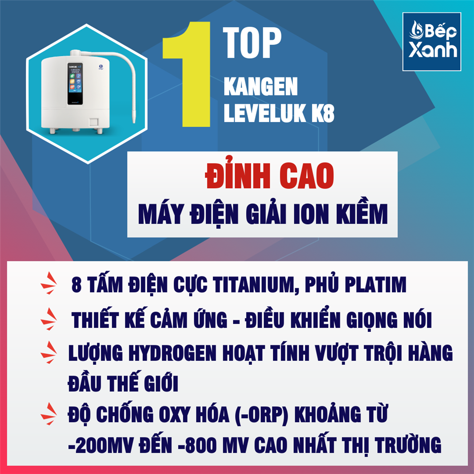 Máy lọc nước điện giải ion kiềm Kangen Leveluk K8 là sản phẩm điện giải xuất sắc nhất trong các dòng máy điện giải ion kiềm hiện nay trên thế giới. Sở hữu trong mình 8 tấm điện cực mạnh mẽ, được sản xuất bằng vật liệu quý Titanium, bề mặt phru Platinum có độ tinh khiết gần như tuyệt đối tới 99,99%. Kangen K8 cho ra 7 loại nước với một dải PH ưu việt mà chưa có một loại máy nào làm được: PH 2.5 đến PH 11.5. Với máy lọc nước điện giải, giá thành quyết định rất nhiều đến quyết định mua hàng của khách hàng. Tuy nhiên, giá thành của Kangen K8cực cao, lên đến 139.000.000đ, nhưng máy lại là sản phẩm bán chạy nhất trong giới điện giải, bởi khách hàng hiểu sản phẩm này có chất lượng, và hiệu quả đã được kiểm chứng từ lâu.