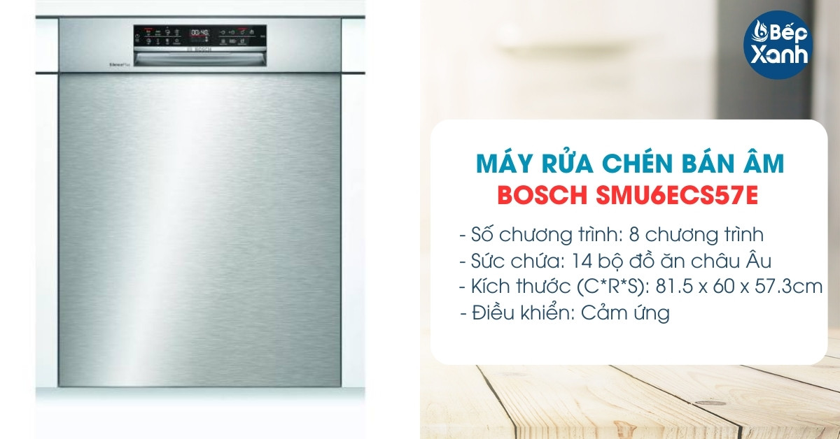 Máy rửa chén Bosch SMU6ECS57E có thiết kế bán âm nhỏ gọn là máy rửa bát Bosch Đức được yêu thích năm 2023. Lớp vỏ máy được hoàn thiện bằng chất liệu thép không gỉ sáng bóng, chịu lực chịu nhiệt tốt và kết hợp hài hoà với nội thất bếp nhà bạn. Bên cạnh đó, công suất hoạt động lớn 2400W với sức chứa 14 bộ đồ ăn châu Âu giúp chén bát được làm sạch nhanh chóng, phục vụ cho các bữa ăn gia đình hay bữa tiệc đều phù hợp.