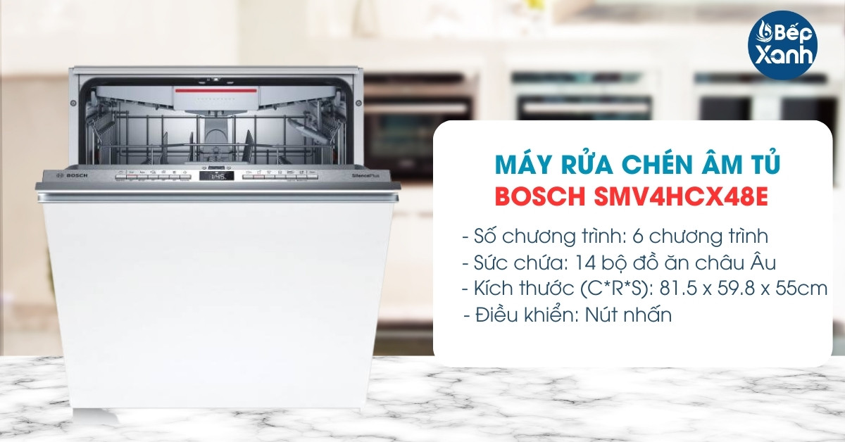 Tiếp theo là một mẫu máy rửa bát nhập khẩu từ Đức của thương hiệu Bosch được người dùng đánh giá cao là máy rửa chén SMV4HCX48E thuộc dòng seri 4. Sản phẩm sở hữu gam màu trắng trang nhã đem đến vẻ đẹp tinh tế và sang trọng cho tổng thể gian bếp. Thiết kế âm tủ với mặt gỗ phía trước kết hợp với cơ chế đóng/mở uyển chuyển giúp bạn dễ dàng thao tác khi sử dụng. Đồng thời, thân máy được lắp âm toàn phần bên trong tủ bếp tối ưu không gian hiệu quả, phù hợp cho các gia đình hạn chế về diện tích như chung cư, căn hộ.
