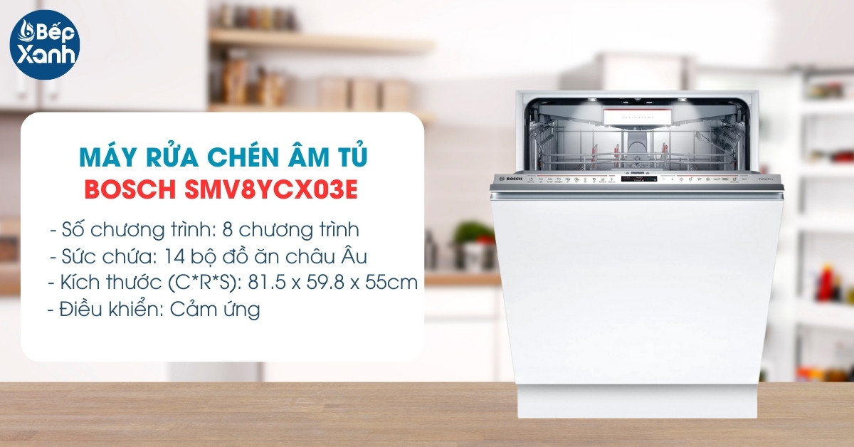 Máy rửa bát Bosch SMV8YCX03E thuộc dòng serie 8 sở hữu thiết kế âm tủ hiện đại, tiết kiệm diện tích bếp. Sở hữu gam màu trắng trang nhã với bảng điều khiển cảm ứng chạm được trang bị bên trong cửa máy giúp người dùng lựa chọn các chương trình rửa dễ dàng và nhanh chóng. Sản phẩm phục vụ tốt cho gia đình 4-5 người tương đương 3-4 bữa ăn người Việt (sức chứa 14 bộ đồ ăn châu Âu).
