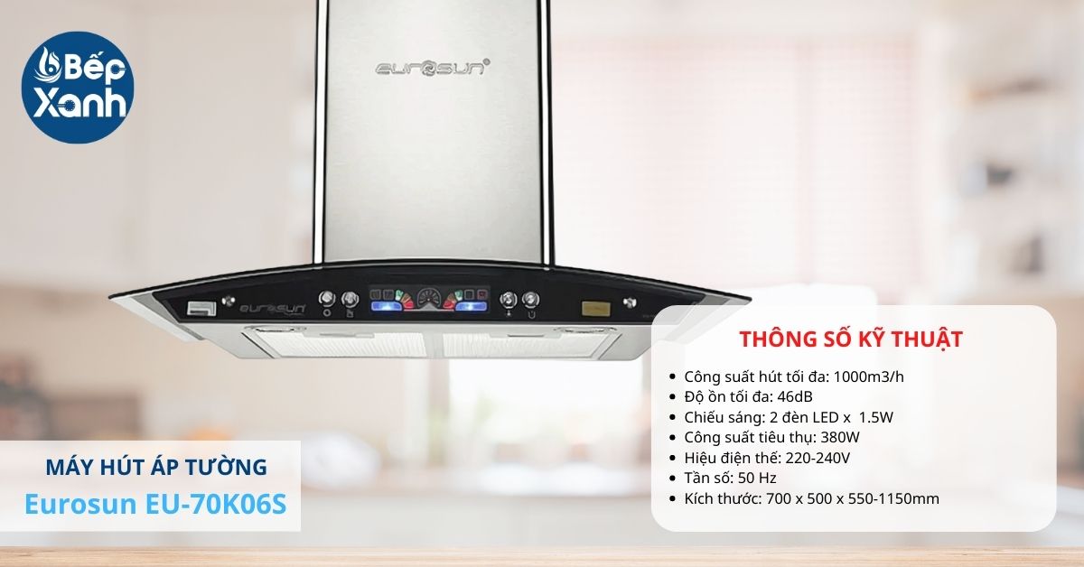 Sản phẩm Eurosun EU-70K06S có khả năng làm sạch không khí vô cùng hiệu quả với công suất hút mạnh mẽ lên đến 1000m3/h với 3 tốc độ hút cho người dùng điều chỉnh phù hợp với nhu cầu sử dụng, từng loại món ăn chế được chế biến. Cơ chế hút khử mùi của máy là bằng than hoạt tính nên đảm bảo nhanh chóng khử mùi hiệu quả, mang lại luồng không khí trong lành cho căn bếp. Dù công suất hút lớn nhưng động cơ máy vận hành rất êm ái, độ ồn tối đa chỉ 46dB sẽ không làm ảnh hưởng đến mọi người trong gia đình khi sử dụng.