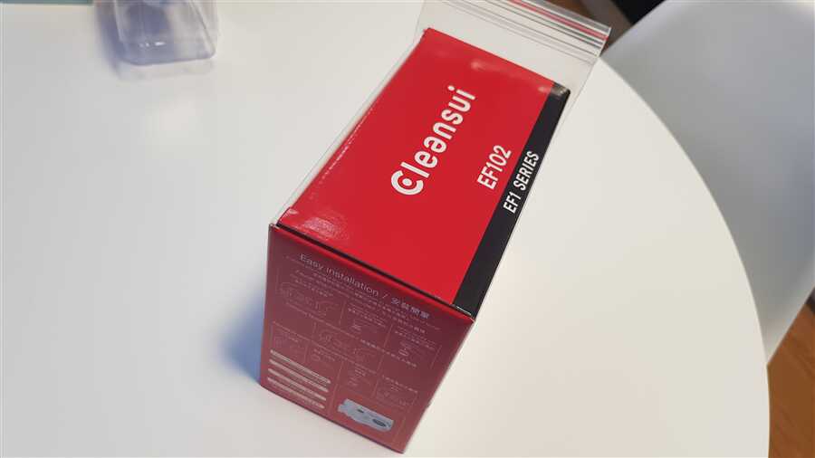 Hộp máy Cleansui EF102 vuông vắn, thể hiện các thông tin cơ bản của thiết bị như xuất xứ, hình ảnh, cùng một số thông tin về cách thức lắp đặt.