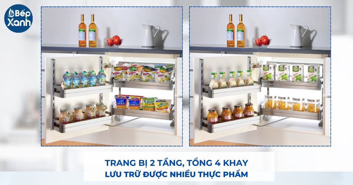 Thiết kế 2 tầng, tổng 4 khay thoải mái lưu trữ thực phẩm khô, có thể thay đổi chiều cao khay chứa