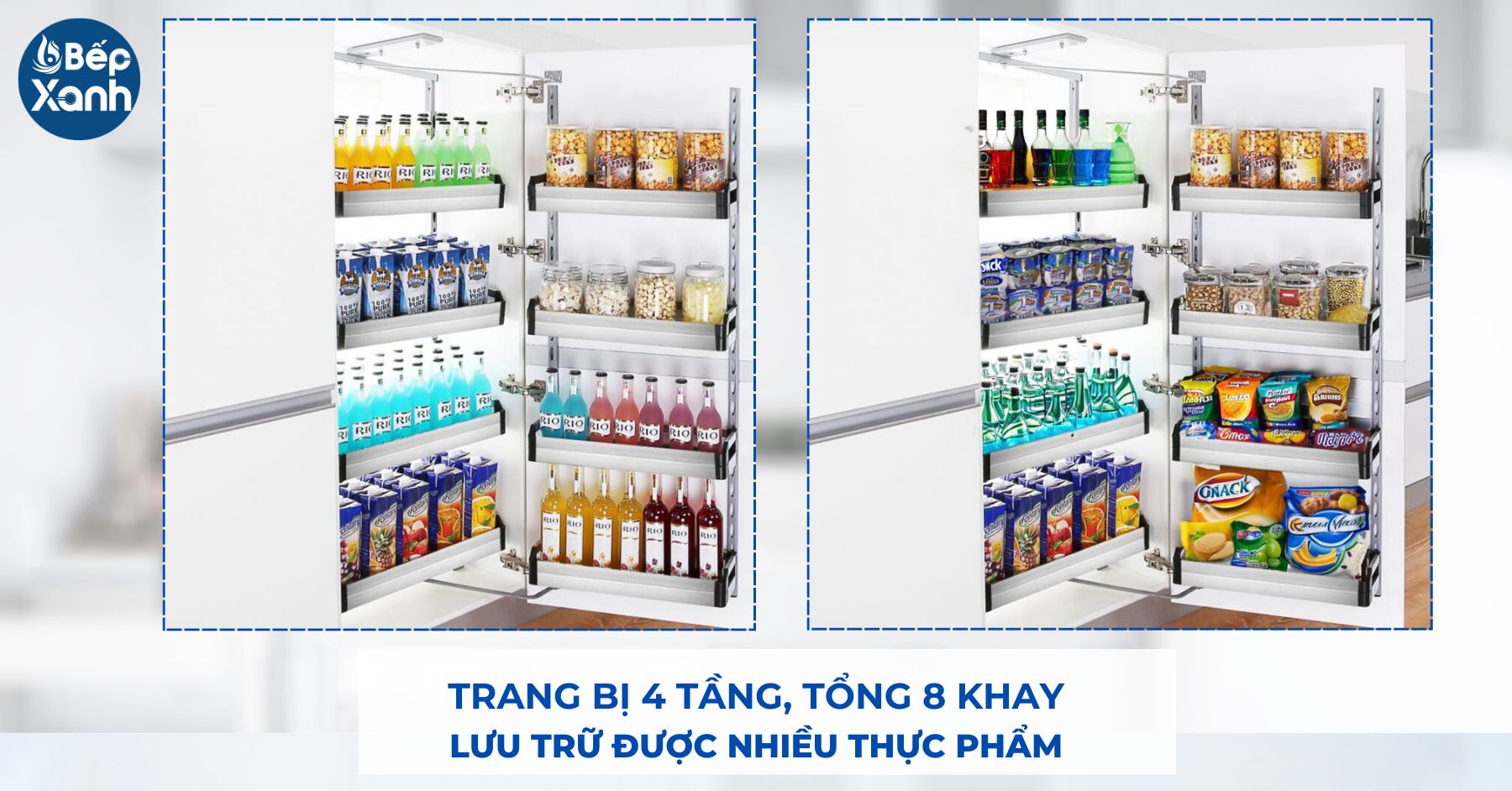 Thiết kế 4 tầng, tổng 8 khay thoải mái lưu trữ thực phẩm khô, có thể thay đổi chiều cao khay chứa