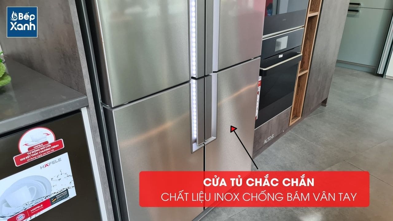 Cửa tủ lạnh HF-SBSIB 539.16.230 bằng inox sáng bóng, có độ bền cao. Đặc biệt là khả năng chống bám vân tay triệt để do được sơn phủ một lớp đặc biệt làm bằng thép tấm không gỉ. Đây là ưu điểm lớn cho sản phẩm vì không phải lau chùi thường xuyên như các mẫu tủ khác.