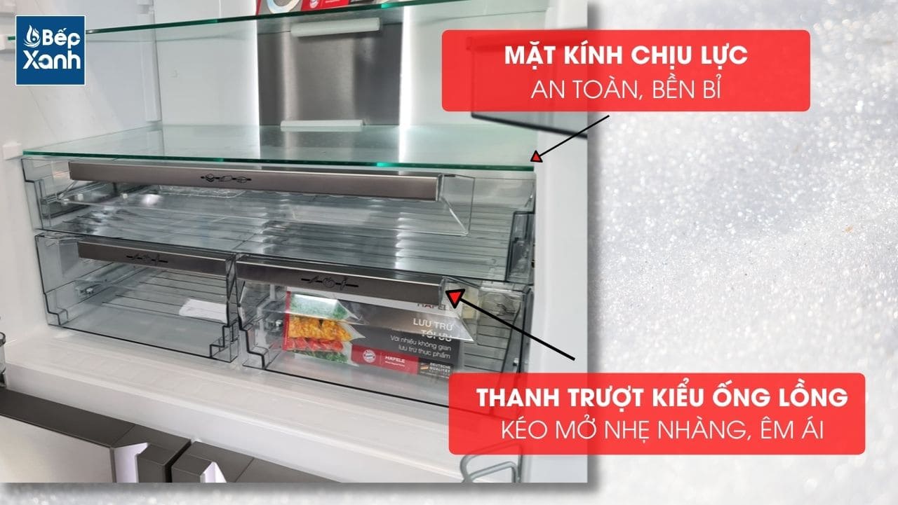Mặt kính bên trong tủ lạnh hoàn thiện chắc chắn, chịu được lực tốt, đặt nhiều thực phẩm mà không sợ nứt vỡ. Song song đó, các ngăn bảo quản cũng được trang bị tay kéo dạng ống lồng, giúp mở ngăn nhẹ nhàng và êm ái.